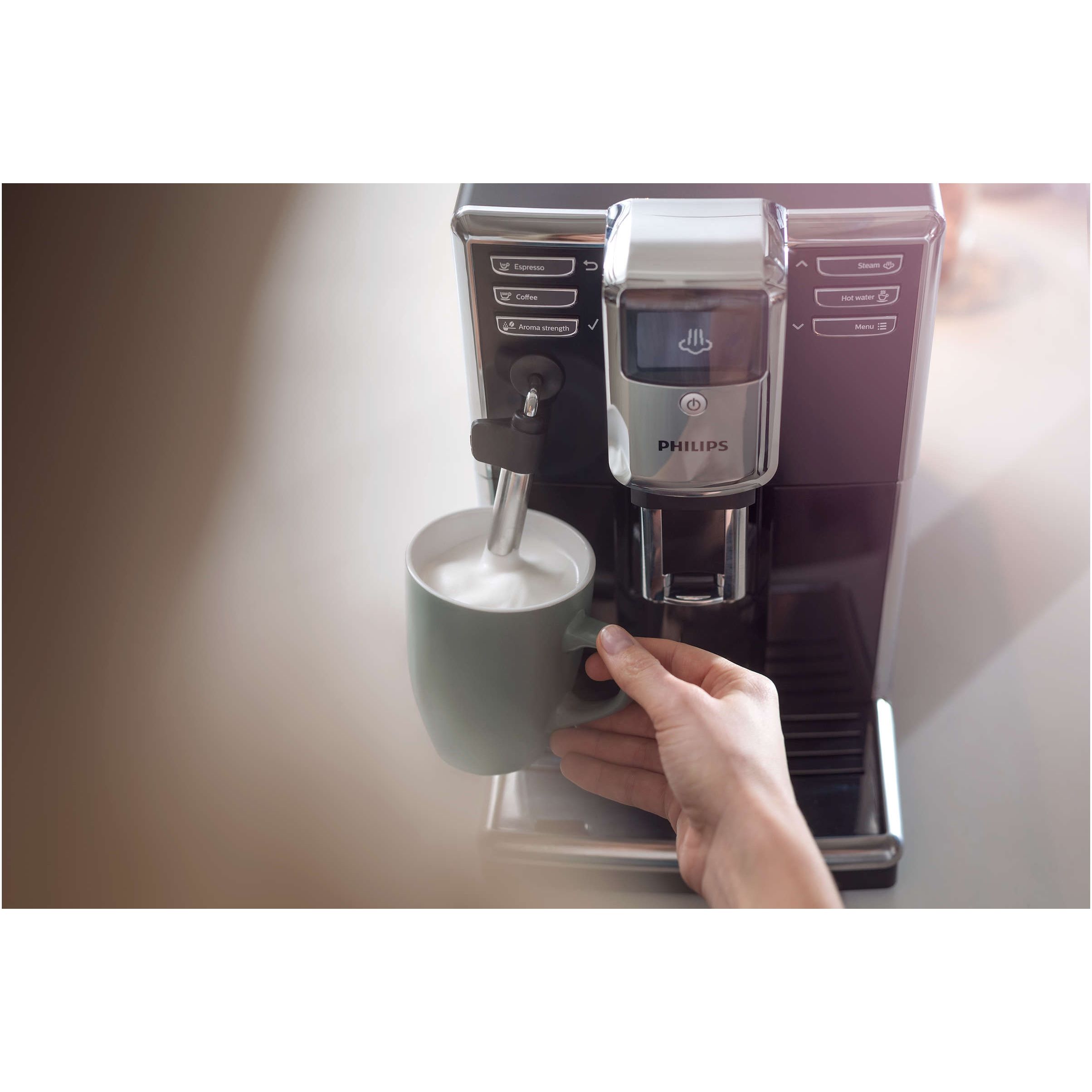 Savurează un espresso excelent cu clătirea automată şi detartrarea ghidată. Acest espressor îşi curăţă automat cu apă circuitul de cafea la pornirea sau oprirea aparatului, oferindu-ţi un gust minunat şi proaspăt la fiecare ceaşcă de espresso. Detartrarea regulată prelungeşte durata de viaţă a espressorului. Aparatul va afişa un mesaj atunci când este necesară detartrarea şi te va îndruma prin mesaje afişate pe ecran, indicându-ţi operaţiile necesare şi momentul la care trebuie efectuate.