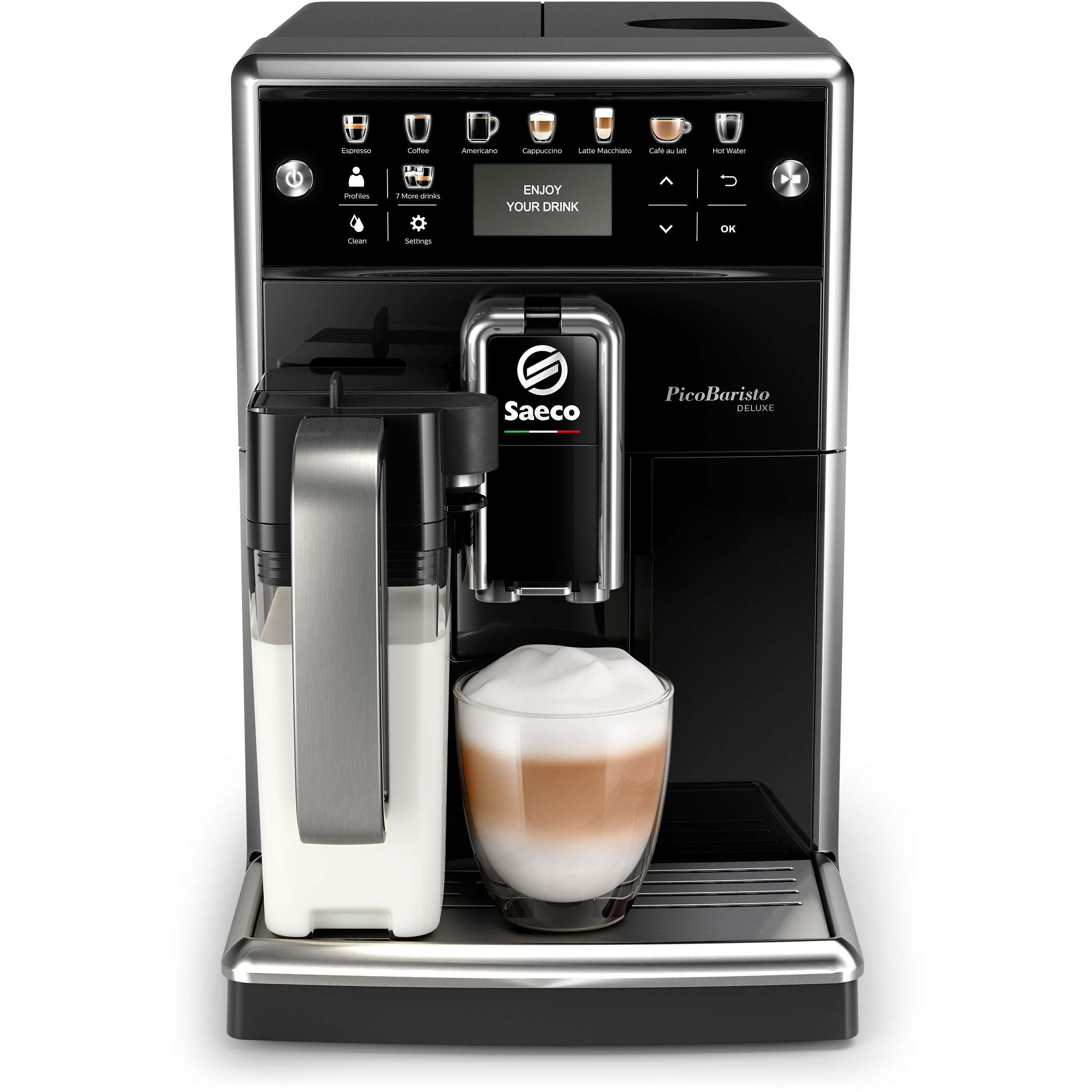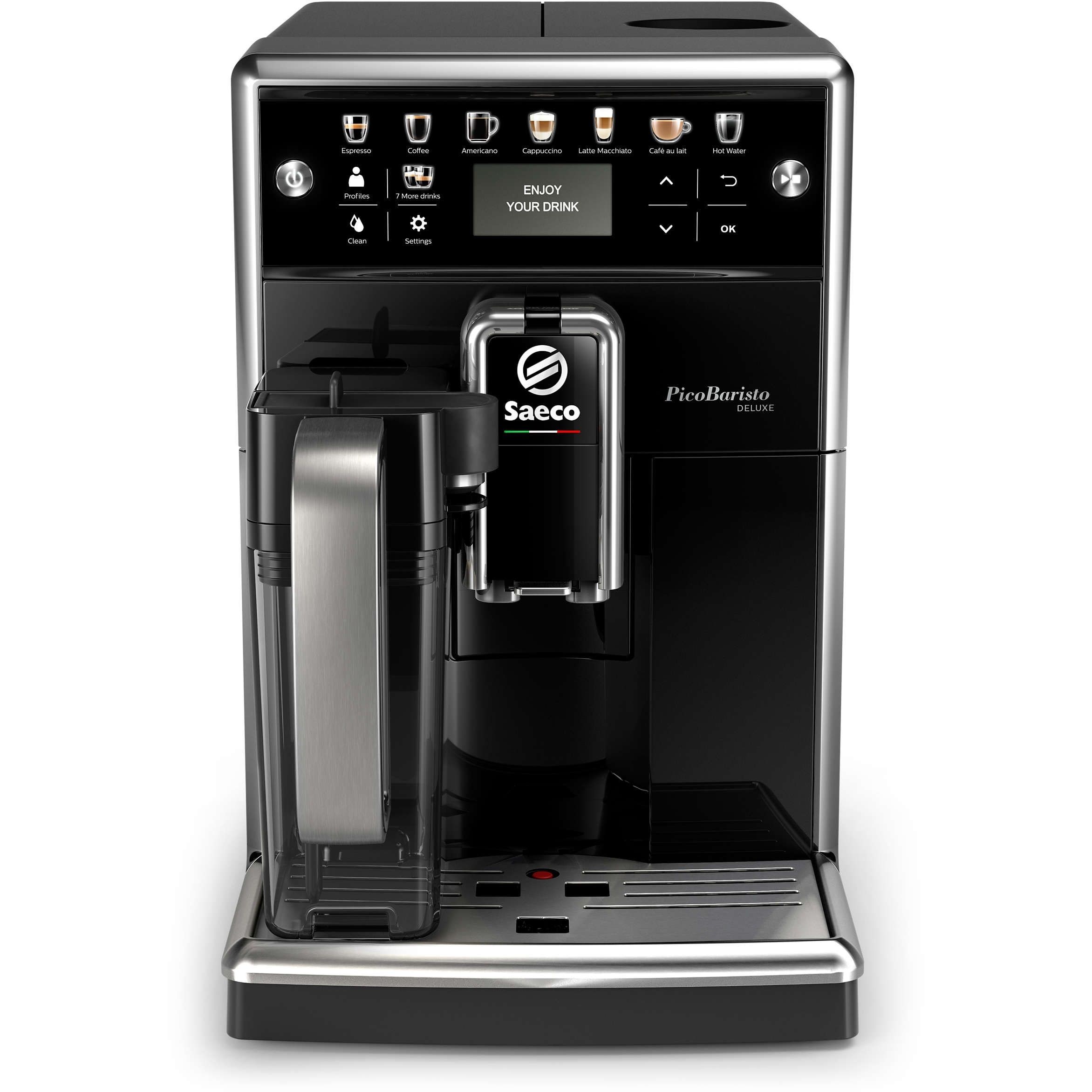 SISTEM DE CURĂŢARE ŞI ÎNTREŢINERE DIN TREI CLICURI. Prin numai trei clicuri, Saeco PicoBaristo Deluxe iniţiază procesul de curăţare de care are nevoie pentru a continua să prepare cafele şi băuturi excelente pentru tine.