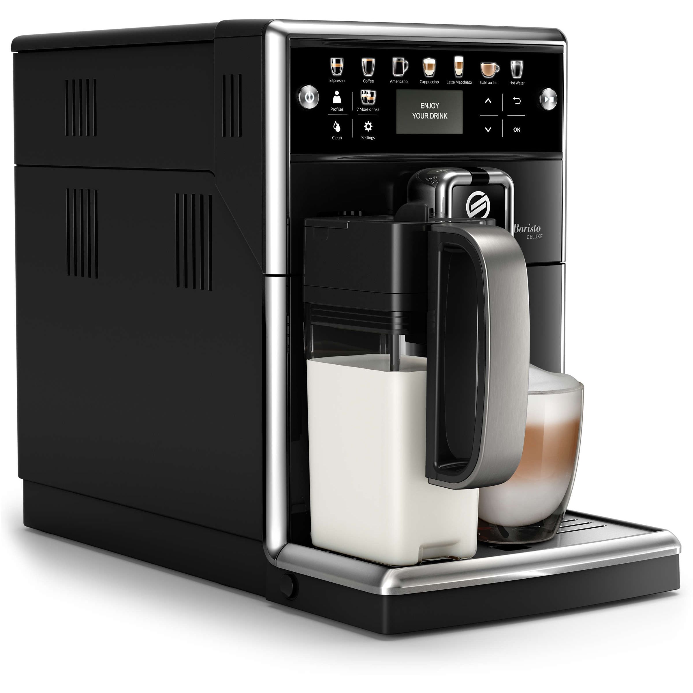 CAPPUCCINO ŞI LATTE MACCHIATO LA O SINGURĂ ATINGERE DE BUTON CU CARAFA PENTRU LAPTE. Savurează cappuccino şi latte macchiato cremoase, la temperatura perfectă, în cel mai simplu mod posibil. Este suficient să torni lapte în carafă, să o cuplezi la espressor şi să îţi selectezi băutura preferată. Indiferent dacă vrei cappuccino sau spumă de lapte, băutura ta preferată va fi gata în câteva secunde, fără stropi pe blatul de lucru şi exact la temperatura potrivită.