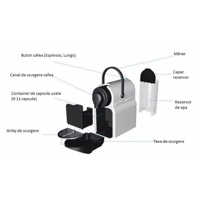 Espresso și Lungo. Nu mai aveți de așteptat pentru a savura o cafea excepțională, cu o simplă atingere a unui buton, în cel mult 25 de secunde, apa atinge temperatura ideală și puteți prepara până la 9 cafele fără a fi nevoie să realimentați rezervorul de apă de 0.7L. Setările din fabrică, pe care le recomandăm pentru prepararea sortimentelor de cafea Nespresso sunt 40 ml de apă pentru espresso și 110 ml de apă pentru lungo, aveți însă posibilitatea de a vă personaliza chiar dumneavoastra volumul de apă dorit pentru prepararea celor două băuturi. Recipient preluare capsule utilizate: 9-11 capsule.