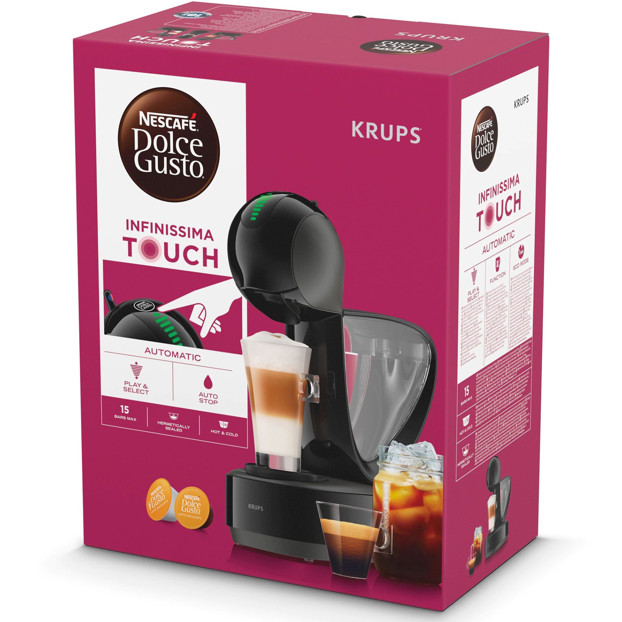 Espressorul automat cu capsule Krups NESCAFÉ® Dolce Gusto® Infinissima Touch: Aparatul elegant ideal pentru a prepara cafele perfecte fara efort. Bucura-te de o multitudine de bauturi pe baza de cafea datorita espressorului automat cu capsule NESCAFÉ® Dolce Gusto® Infinissima de la Krups. Prepara bauturi profesionale cu o spuma catifelata datorita sistemului de inalta presiune de pana la 15 bari. Infinissima Touch este un espressor elegant, cu un design modern, inspirat din semnul Infinitului ce ofera clipe memorabile alaturi de cei dragi. Tot ce trebuie sa faci este sa introduce capsula in aparat si sa selectezi una din retete folosind ecranul tactil LED. Poti alege bauturi XL datorita functiei dedicate. Recipientul pentru apa este detasabil si ofera o capacitate de 1.2L. Fie ca preferi bauturi reci sau calde, aparatul iti ofera ambele tipuri de bauturi, toate usor de accesat in meniul cu peste 35 de retete. Modul ECO opreste automat espressorul dupa 1 minut de inactivitate, in timp ce Functia Anticalcar ofera o mentenanta usoara.