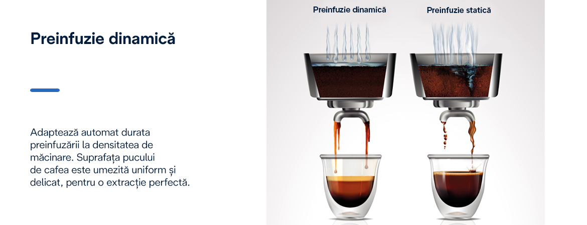 Durata pre-infuziei se adaptează la densitatea dozei selectate pentru a asigura o suprafață umedă în mod uniform, maximizând rezultatele extracției.