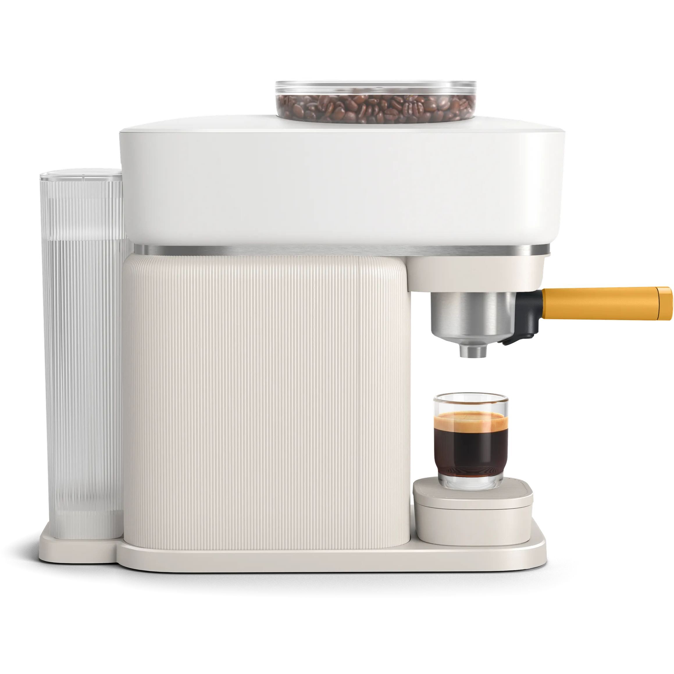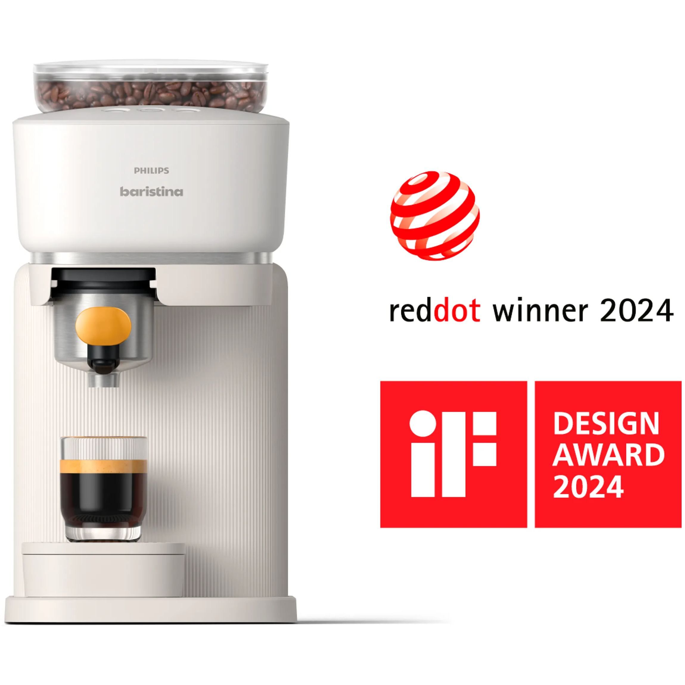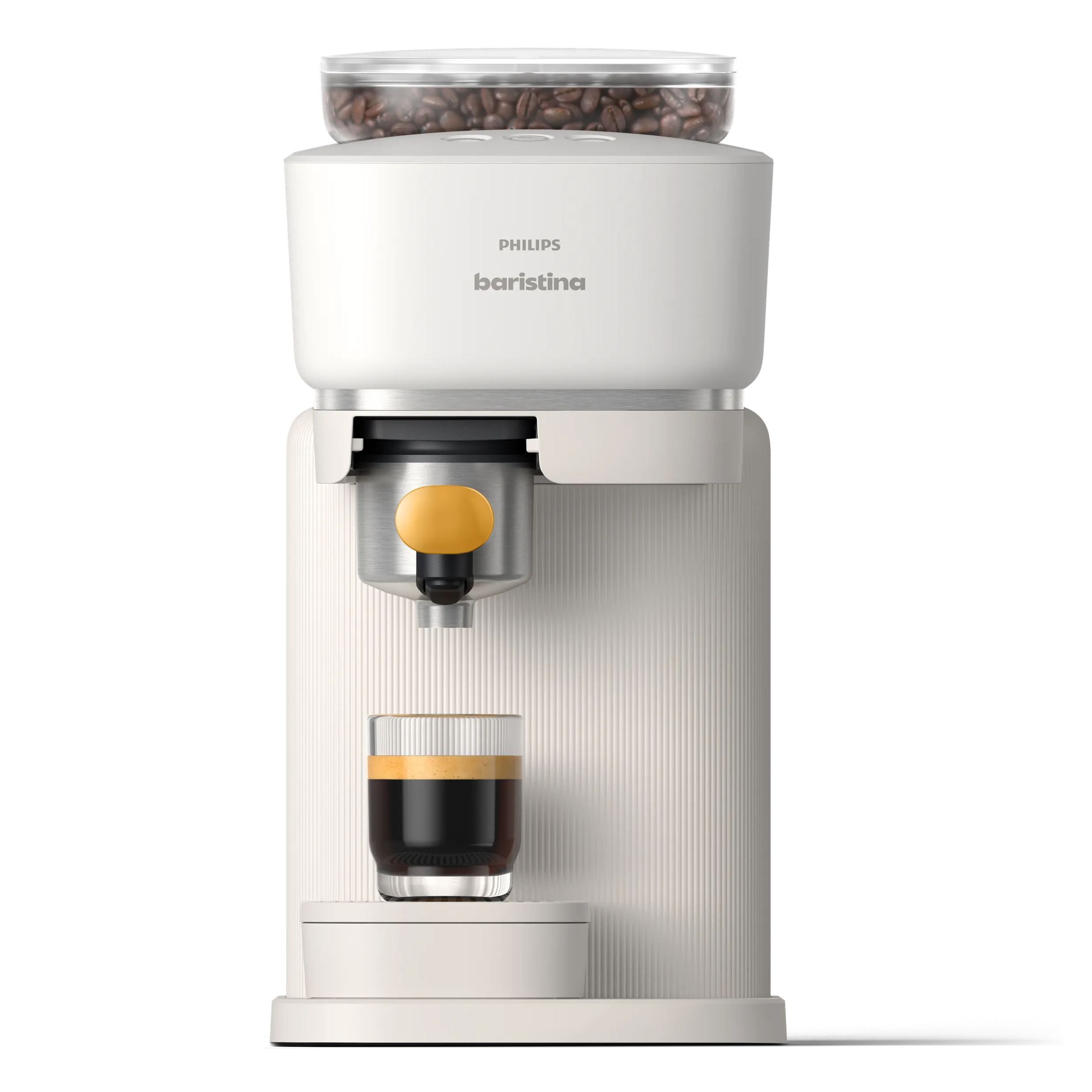 Espressor manual Philips Baristina BAR300/03, 16 bar, Râșniță ceramică, Boabe 170gr, Rezervor 1.2l, Platformă pentru cești, Oprire automată, Espresso și Lungo, Portafiltru galben, Milky White