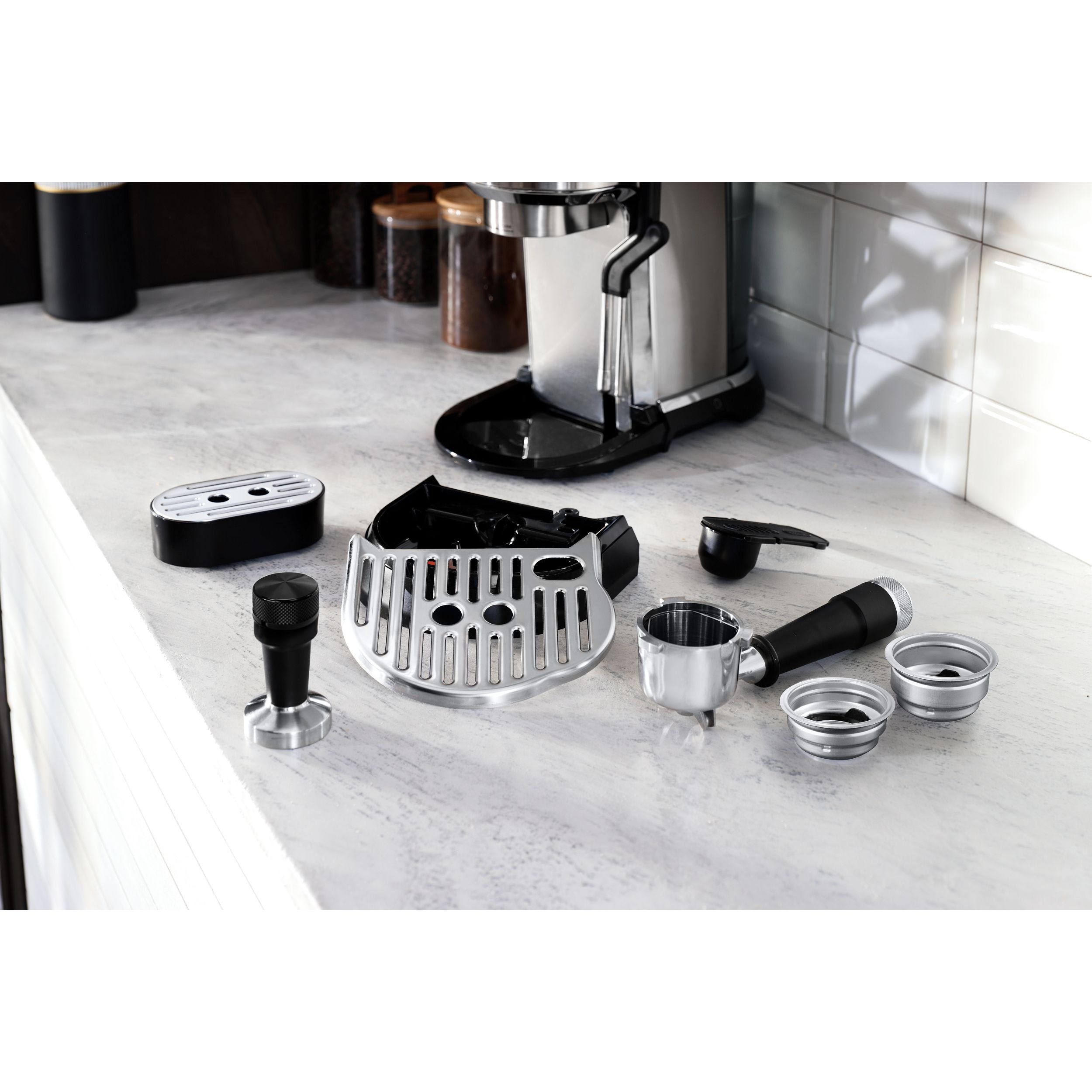 Este furnizat cu o varietate de accesorii utile incluse în pachet: tamper pentru cafea, cană pentru lapte, lingură de dozare pentru cafea și instrumente de curățare.