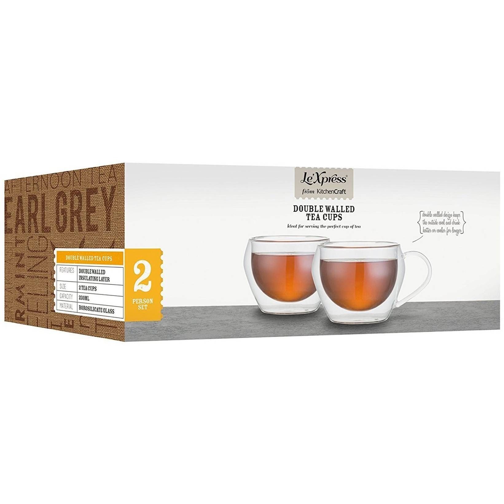 Set de 2 cești de ceai LE’XPRESS. Marca Kitchen Craft, capacitatea de 230 ml fiecare, acestea fiind fabricate din sticlă.