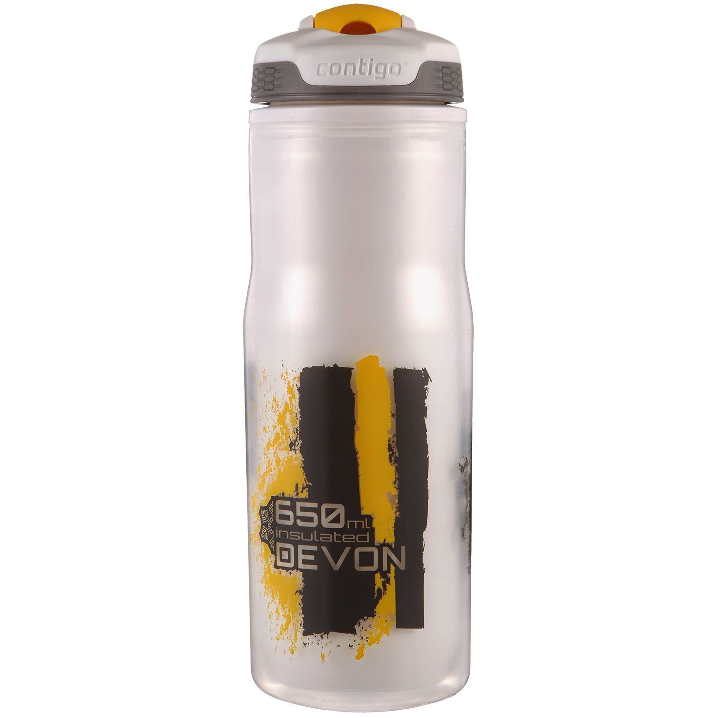 Sticla de apa Contigo Devon Insulated. Capacitate 650ml. Protectia capacului mentine sticla de apa curata si protejata. Constructia cu perete dublu mentine temperatura lichidului mai bine decat alte sticle pentru sport. 100% garantat impotriva scurgerilor sau varsarii de lichid. Butonul AUTOSPOUT™ opereaza duza de baut cu o singura atingere. Stilul de operare si tehnologia AUTOSPOUT recomanda aceasta cana special pentru ciclisti. Ciocul nu trebuie muscat, ceea ce face administrarea de fluid mult mai comoda si, in acelasi timp, mult mai igienica. Operare cu o singura mana. Nu contine BPA. Sigur pentru raftul superior al masinii de spalat vase. Culoare: Yellow.