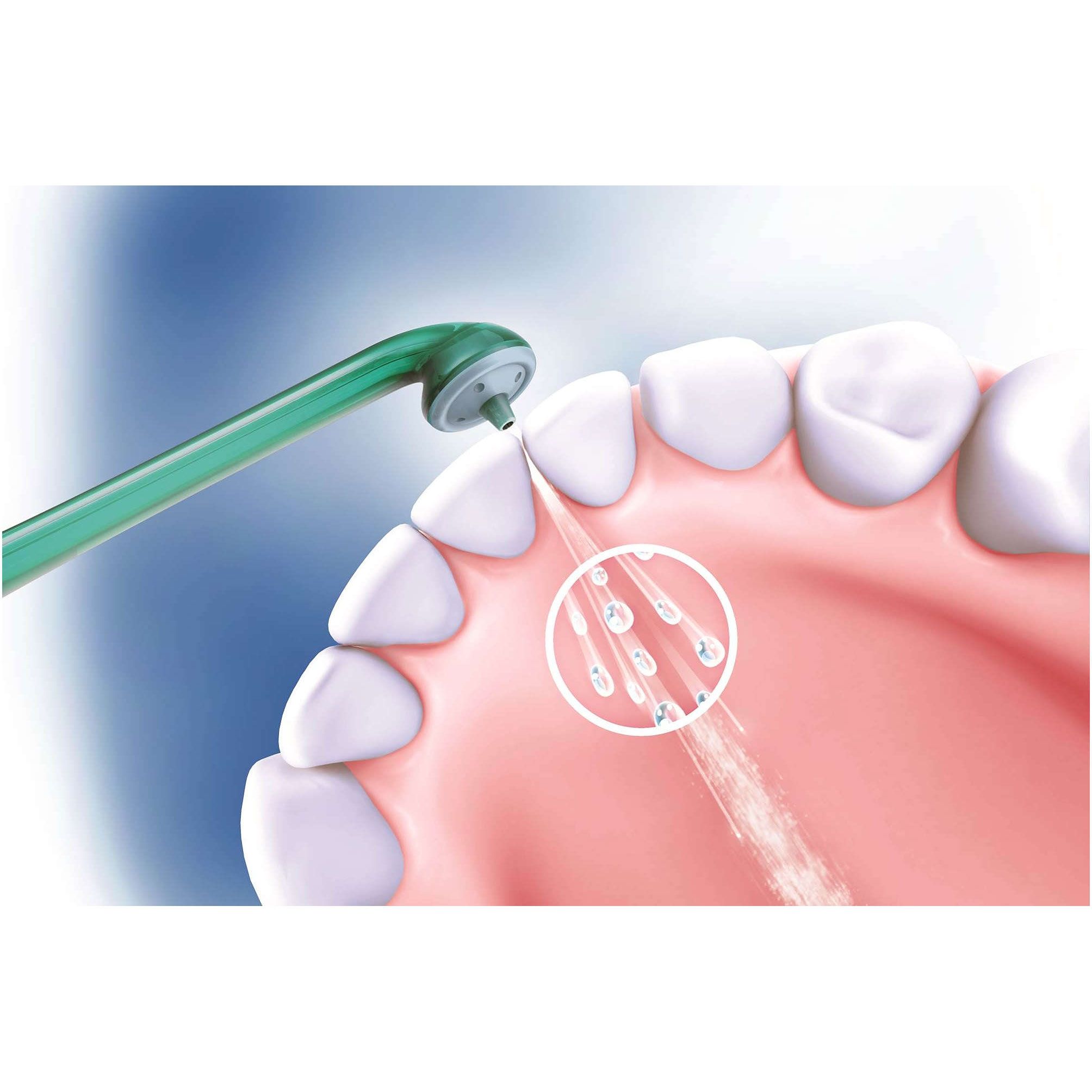 Vârful de ghidaj asigură amplasarea corectă. Capul înclinat şi subţire și vârful de ghidaj facilitează găsirea amplasării corecte. Nu trebuie decât să glisezi vârful de-a lungul suprafeţei dintelui lângă linia gingiilor până când intră în spaţiul dintre dinţi.