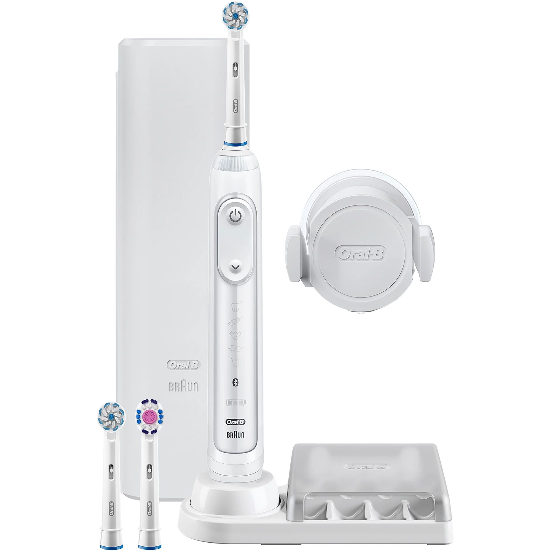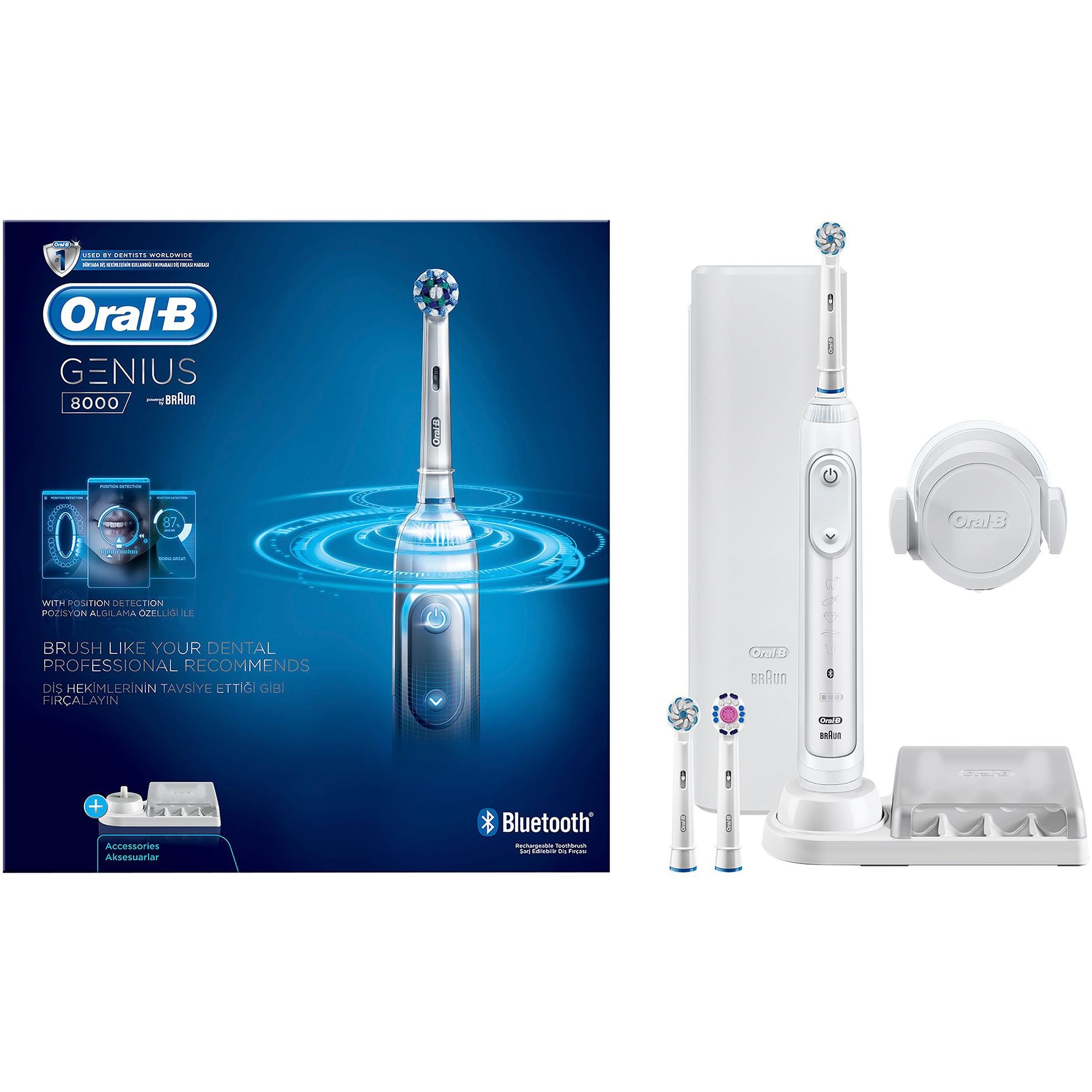 Dinţi mai albi din prima zi. Periuţa Oral-B GENIUS 8000 îndepărtează petele de suprafaţa încă de la prima spălare mulţumită capătului de periuţă 3D White. Acesta este dotat cu o cupă de albire care reţine pasta de dinţi pe periuţă pentru mai mult timp. Pentru o rutină de periaj îmbunatăţită, poţi să foloseşti periuţa împreună cu programul special de albire al aplicaţiei pentru smartphone Oral-B.