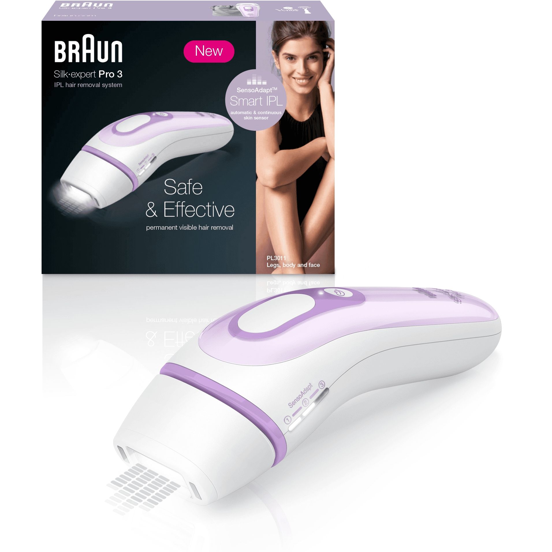 Cel mai sigur aparat cu IPL, datorită tehnologiei SensoAdapt™. Culoarea pielii variază pe suprafața corpului; senzorul SensoAdapt™ (cu protecție UV) citește continuu culoarea pielii și ajustează intensitatea impulsului pentru îndepărtarea definitivă sigură și eficientă a părului nedorit.