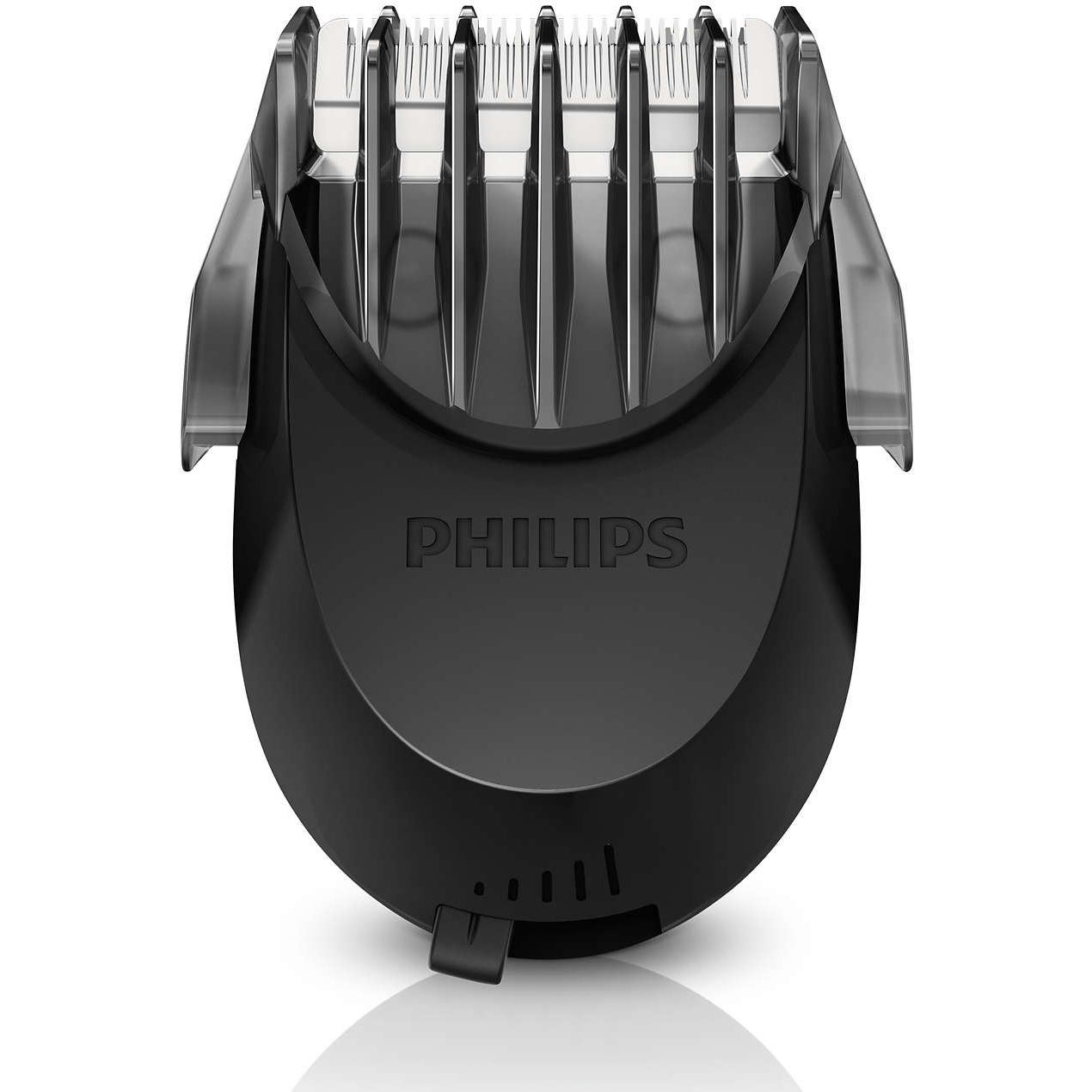 Accesoriu de aranjare a bărbii cu ataşare printr-un clic cu 5 setări de lungime. Schimbă-ţi stilul cu accesoriul SmartClick pentru aranjarea bărbii. Alege din 5 setări de lungime pentru a crea orice, de la un aspect nebărbierit perfect la o barbă scurtă, îngrijită. Vârfurile şi pieptenii rotunjiţi sunt proiectaţi pentru a preveni iritarea pielii.