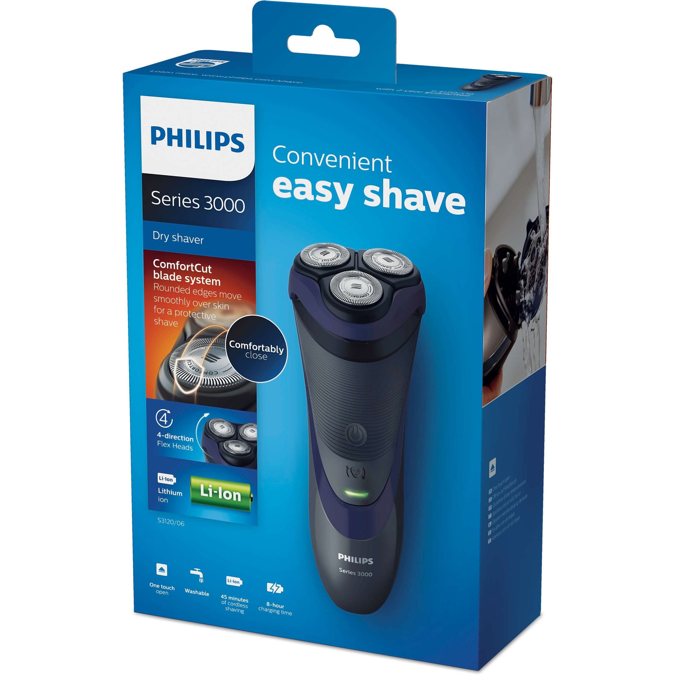 45 de minute de bărbierit fără fir după o încărcare de opt ore. Vei avea un timp de funcţionare de 45+ minute - aproximativ 15 sesiuni de bărbierit - totul după o încărcare de opt ore. Sau poţi alege să te bărbiereşti cu dispozitivul conectat la priză.
