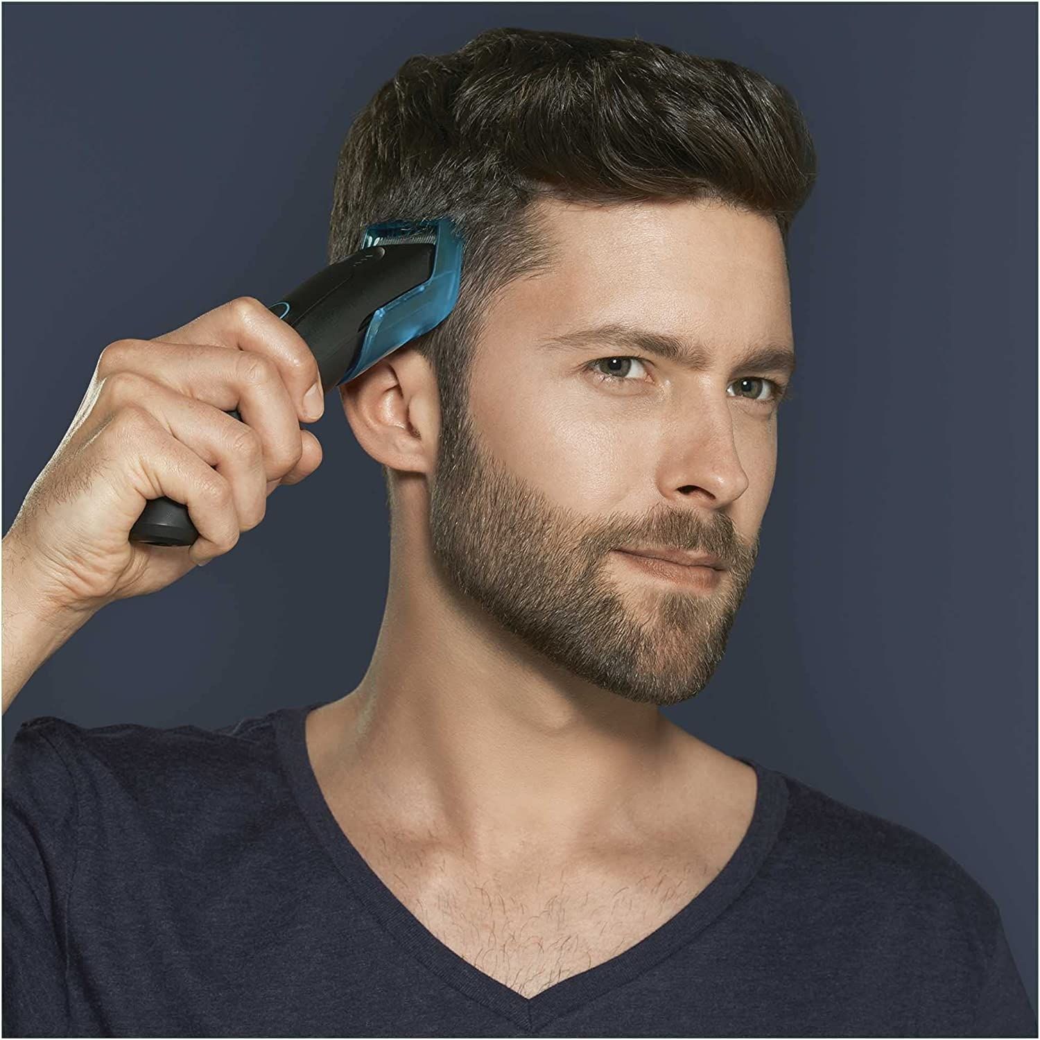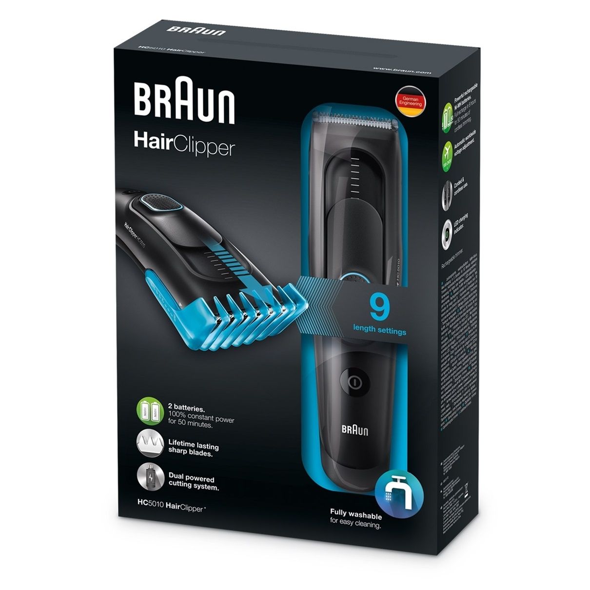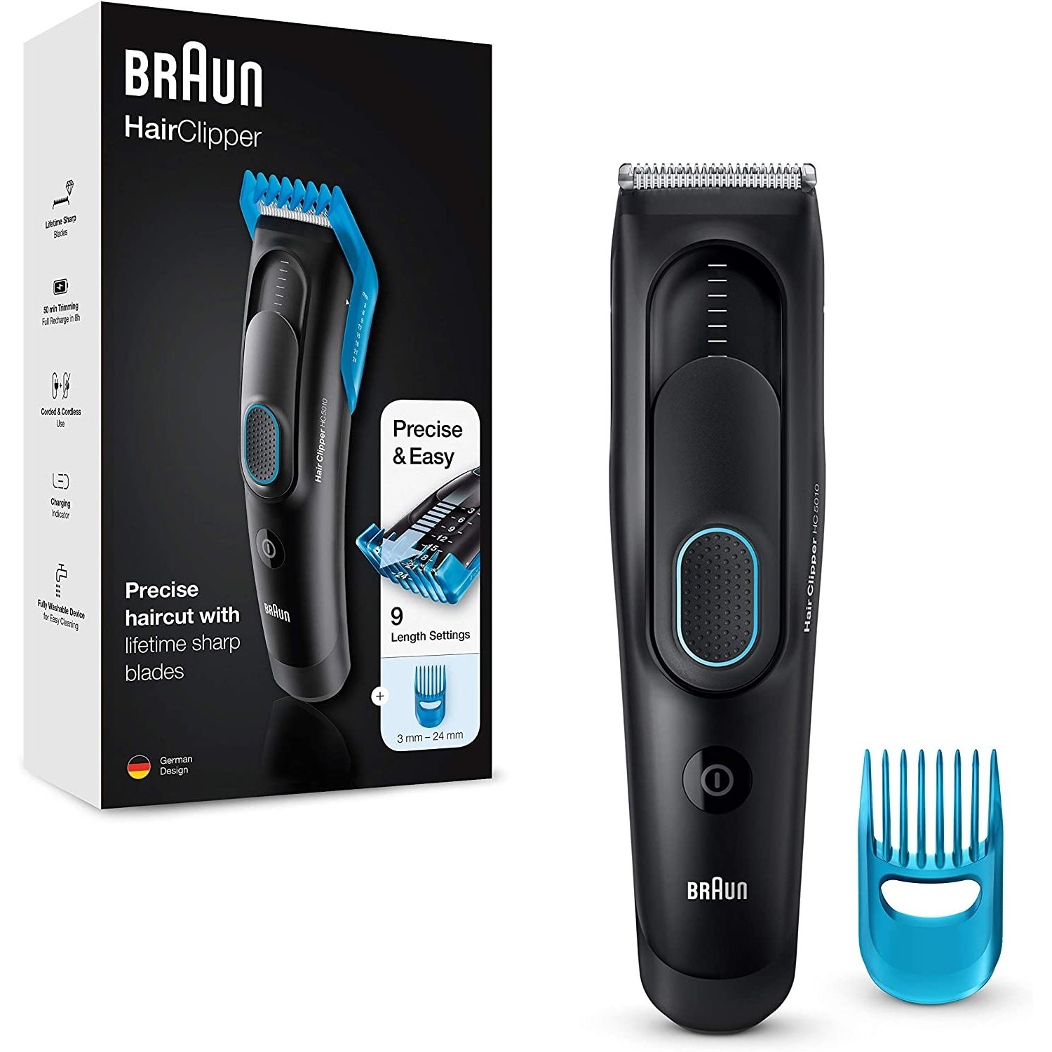 Aparat de tuns BRAUN HC5010, Timp de încărcare 8ore, 9 ghidaje de tăiere, autonomie 40 min, lavabil, culoare: negru/albastru