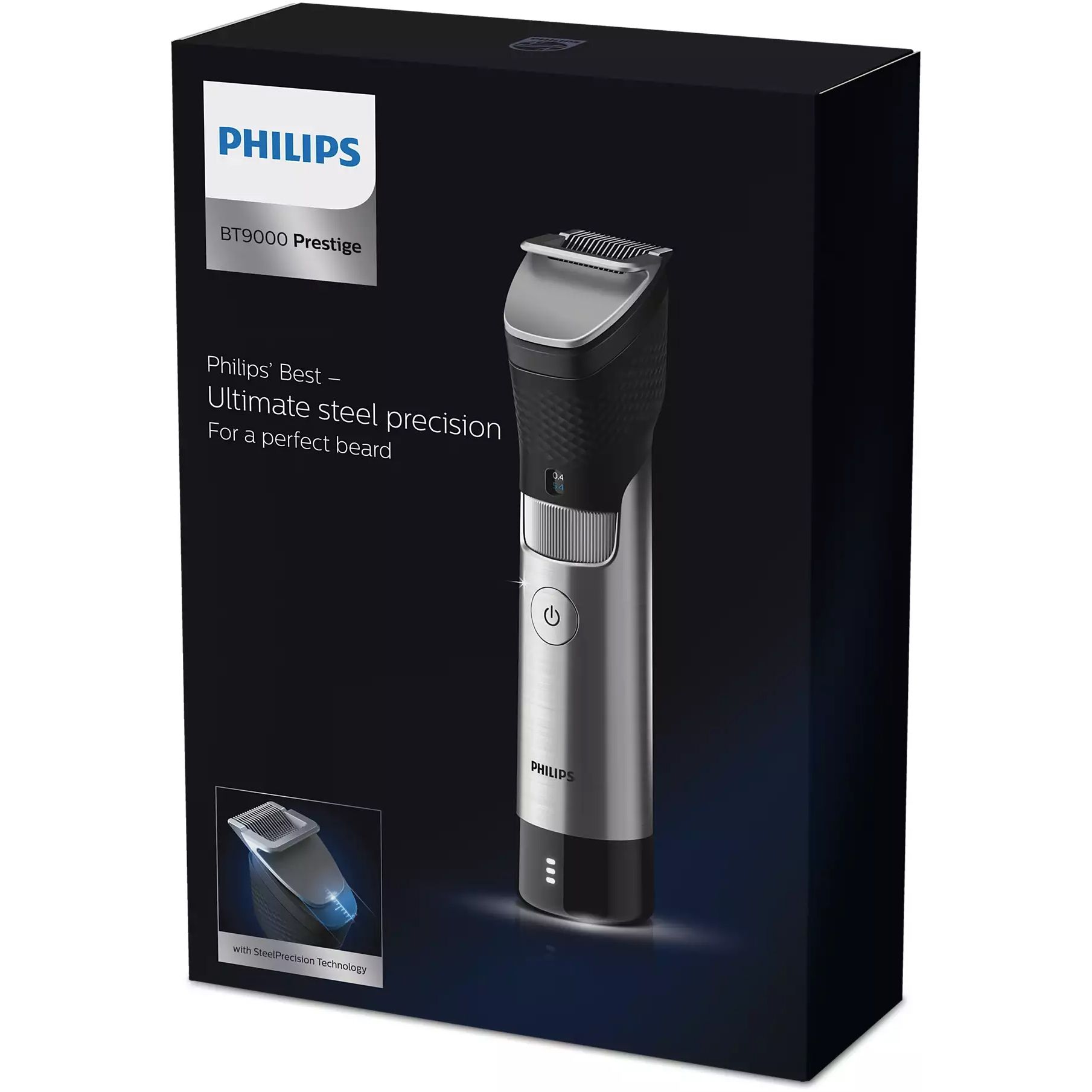 Precizie absolută, cu tehnologia SteelPrecision unică. Aparatul BT9000 Prestige este dotat cu nou-nouţa tehnologie SteelPrecision, care constă dintr-un pieptene metalic integrat şi un cuţit robust. Acest sistem nu se îndoaie ca un pieptene din plastic, indiferent de presiunea aplicată. În acest mod, BT9000 Prestige asigură întotdeauna cele mai uniforme şi mai precise rezultate de tundere*.