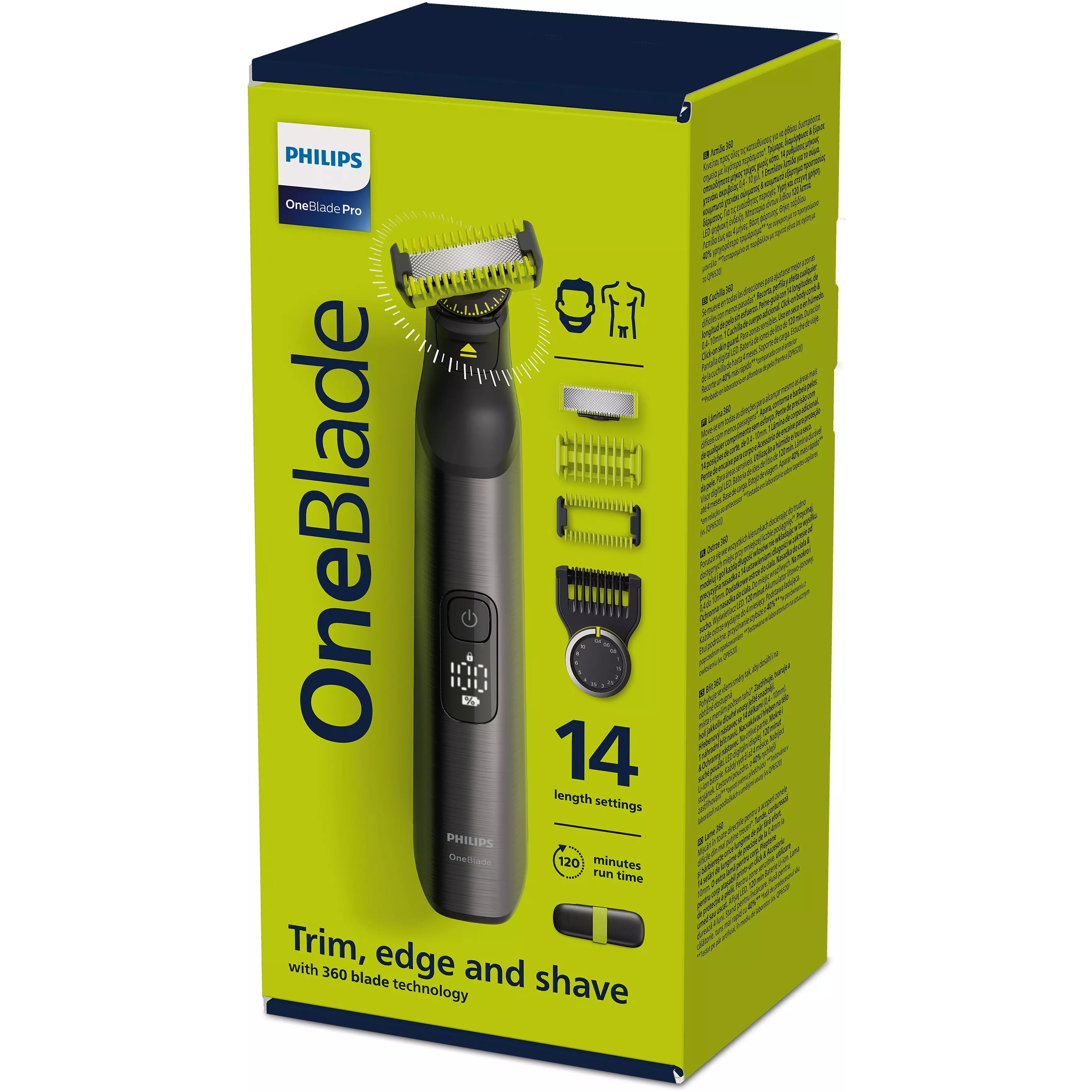 Philips OneBlade Pro Face + Body tunde, conturează şi rade orice lungime de păr. Ai o lamă pentru faţă şi o lamă pentru corp cu accesoriu de protecţie a pielii. Nu mai este nevoie să foloseşti mai multe instrumente. OneBlade face totul.