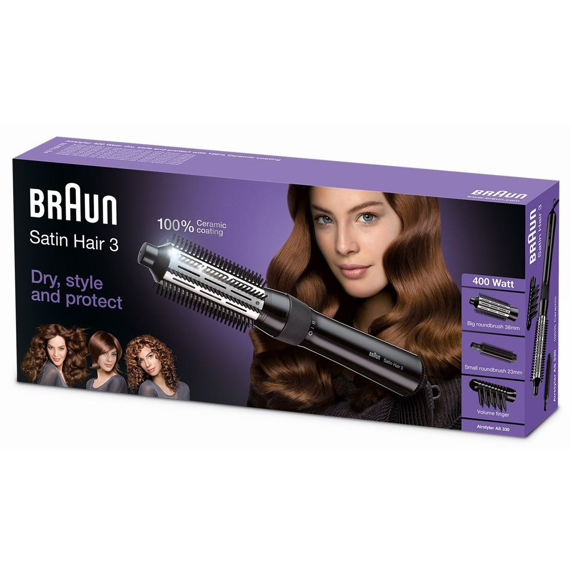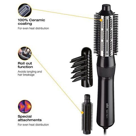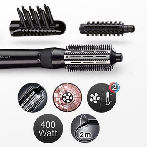 Peria de coafat Braun Satin Hair 3 are multiple ataşamente concepute special pentru a crea orice coafură. Utilizaţi peria rotundă mica (18 mm) pentru bucle, cea mare (36 mm) pentru onduleuri, iar ataşamentul de volum pentru un păr voluminos de la rădăcină.