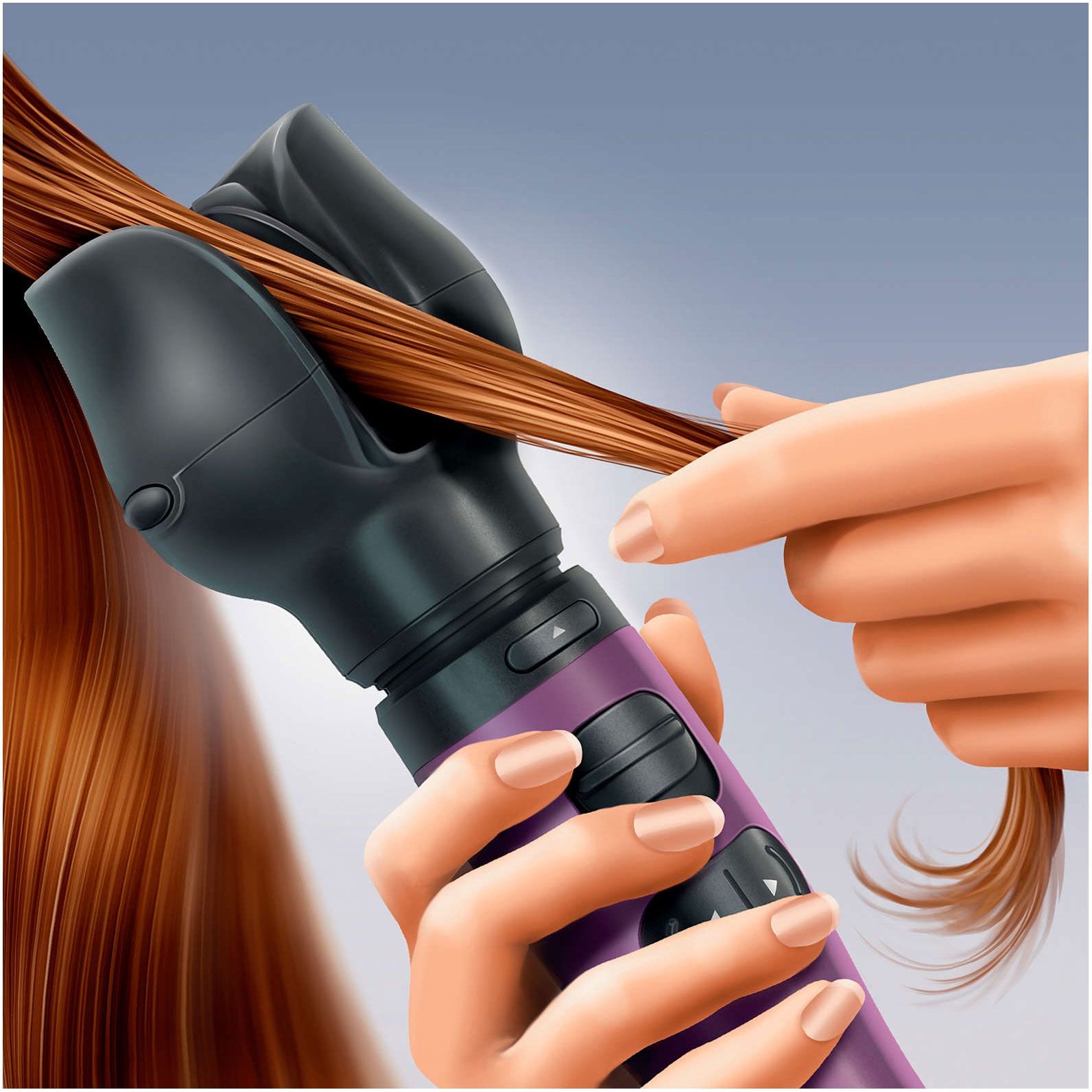 Accesoriul de ondulare automată creează onduleuri şi bucle lejere. După ce ţi-ai uscat părul în proporţie de 80%, aşează o şuviţă de păr în deschiderea accesoriului de ondulare automată. La atingerea unui buton, şuviţa de păr dispare în camera de ondulare, unde este uscată şi coafată. Astfel obţii o buclă frumoasă, pentru un aspect minunat şi natural.
