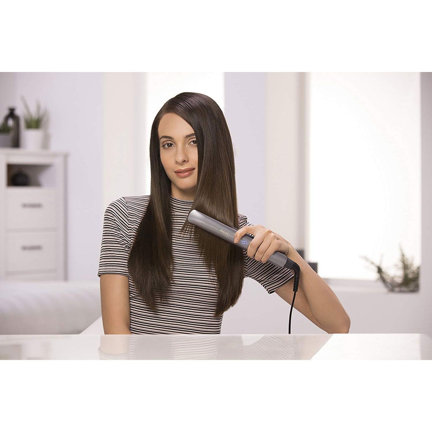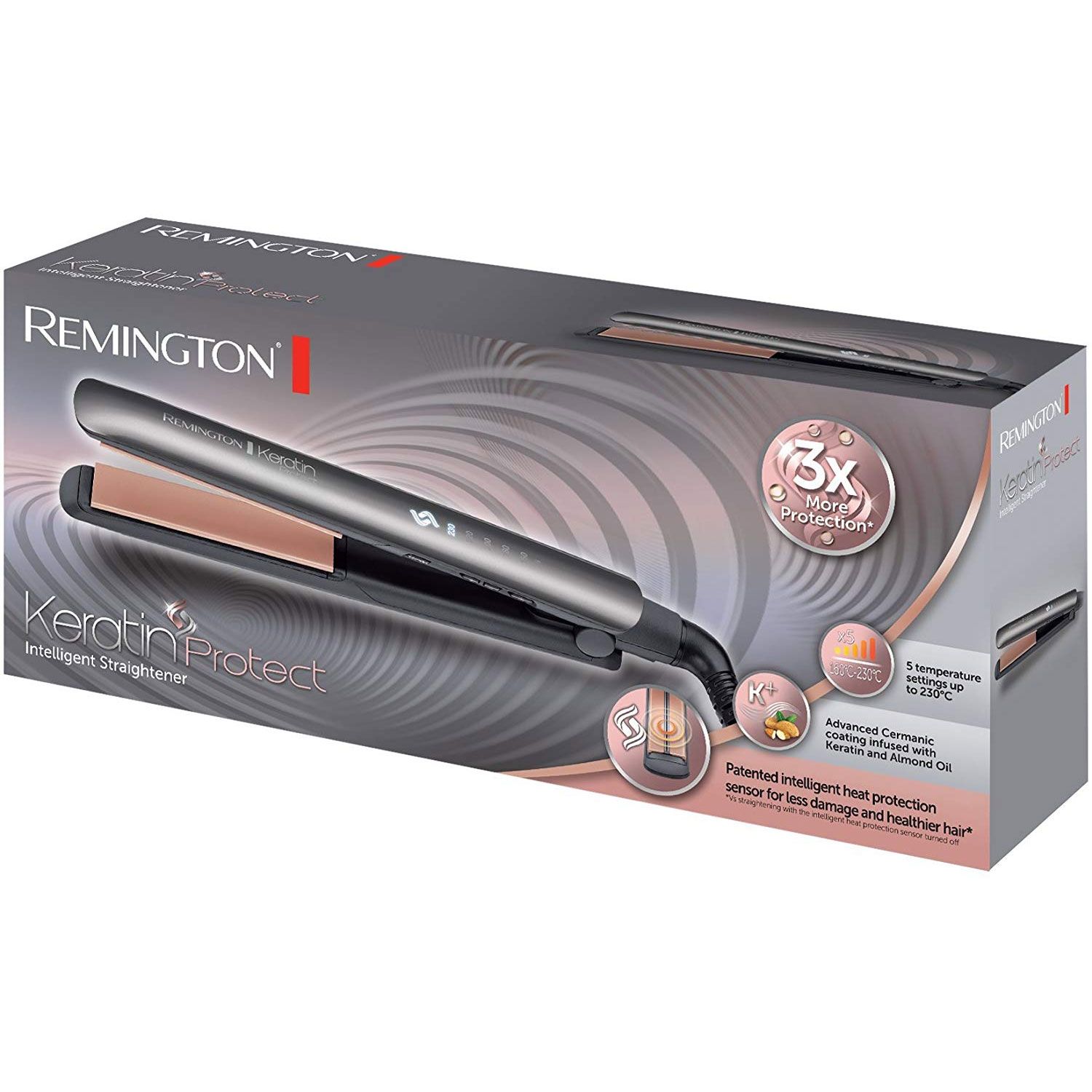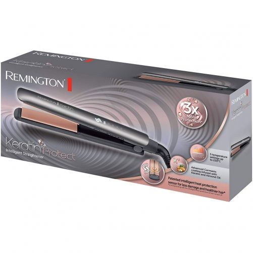 Protejează-ți părul, alege stilul care ți se potrivește. Din fericire, Remington are o soluție pentru a opri daunele produse de căldura excesivă și de lipsa de protecție. Placa de îndreptat părul inteligență Keratin Protect – o placă de îndreptat părul revoluționară care detectează continuu nivelul unic de umiditate din părul tău și ajustează căldura la temperatura optimă pentru coafare pentru el, oferind de 3 ori mai multă protecție*, mai puține daune cauzate părului și un păr mai sănătos*. Exprimă-ți stilul unic fără a compromite sănătatea părului tău, obținând o coafură de lungă durată, mai sănătoasă, cu un finisaj profesionist ca de salon! Colecția Keratin Protect de la Remington este o gamă de aparate de coafat inovative care te ajută să îți menții părul puternic în timpul coafării și care utilizează ceramica avansată cu Cheratină și Ulei de Migdale pentru a oferi un păr mai mătăsos și mai strălucitor.