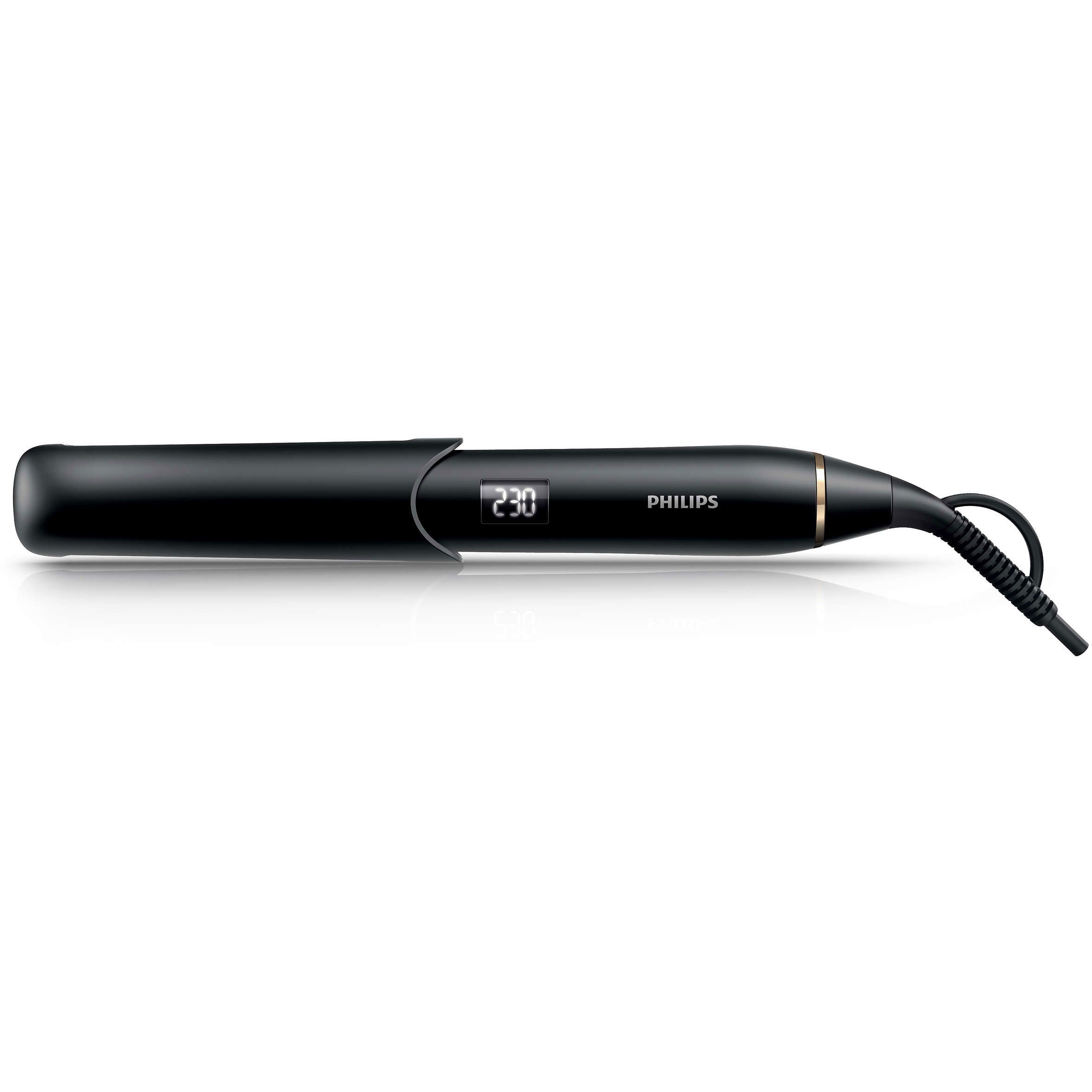 Depozitare sigură a produsului cu capacul de protecţie împotriva căldurii. Capacul special de protecţie împotriva căldurii are beneficii multiple, cel mai importat fiind faptul că este confecţionat dintr-un material rezistent la căldură. După utilizare, glisează capacul de pe placa de păr pentru a permite depozitarea imediată. Acesta va proteja de asemenea plăcile pentru îndreptat părul împotriva zgârieturilor şi va bloca aparatul în timpul depozitării.