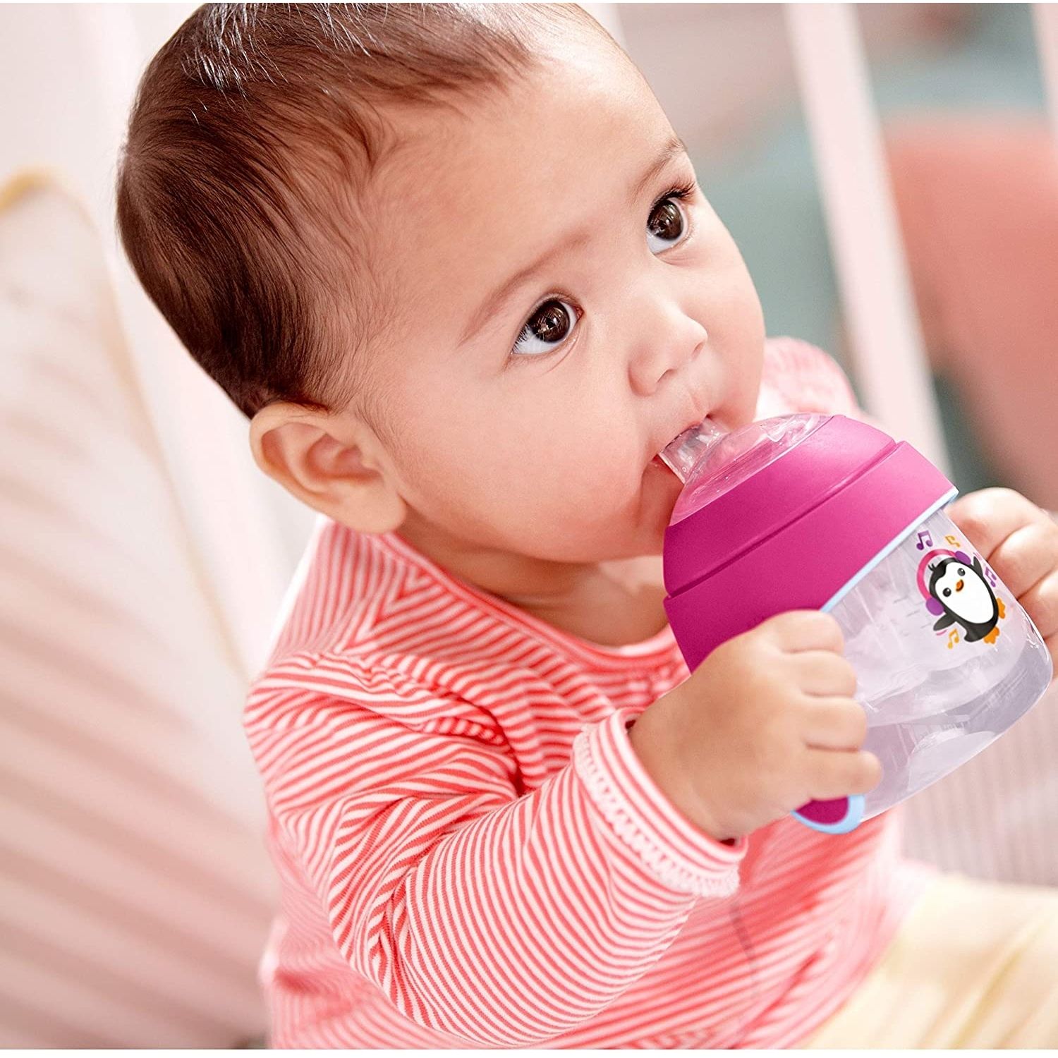 Scurgerea în unghi atenuează înclinarea capului. Scurgerea în unghi este concepută pentru a-i ajuta pe copiii mici să soarbă primele înghiţituri, fără a înclina prea mult capul pe spate.