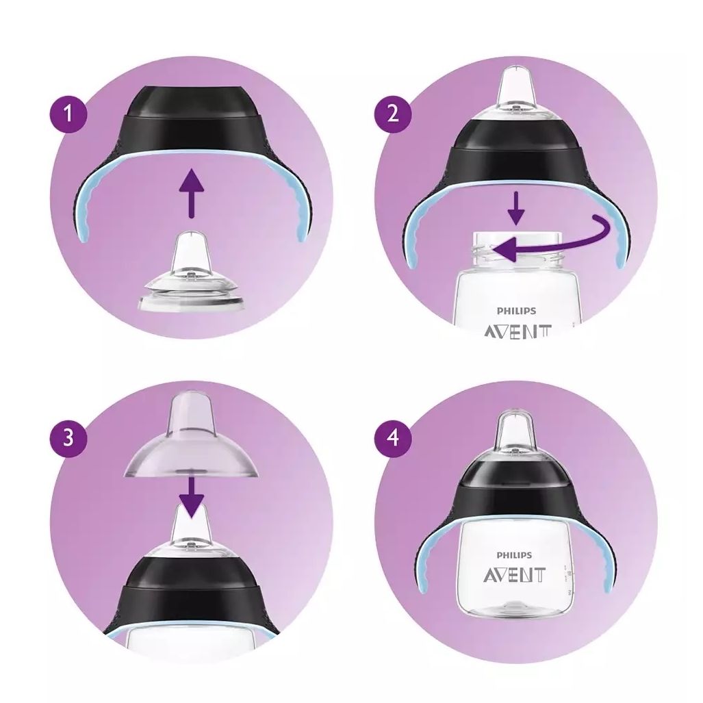 Compatibilă cu biberoanele şi cănile Philips Avent. Toate biberoanele şi cănile Philips Avent sunt compatibile, mai puţin biberoanele din sticlă şi cănile „Sunt mare”/„Prima mea cană de copil mare”. Poţi combina şi potrivi aşadar piesele pentru a crea cana perfectă, care să se potrivească nevoilor individuale de dezvoltare ale copilului tău.