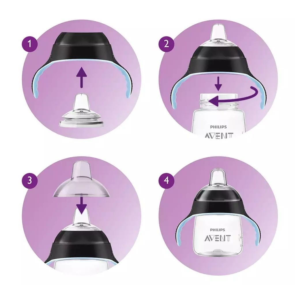 Compatibilă cu biberoanele şi cănile Philips Avent. Toate biberoanele şi cănile Philips Avent sunt compatibile, mai puţin biberoanele din sticlă şi cănile „Sunt mare”/„Prima mea cană de copil mare”. Poţi combina şi potrivi aşadar piesele pentru a crea cana perfectă, care să se potrivească nevoilor individuale de dezvoltare ale copilului tău.