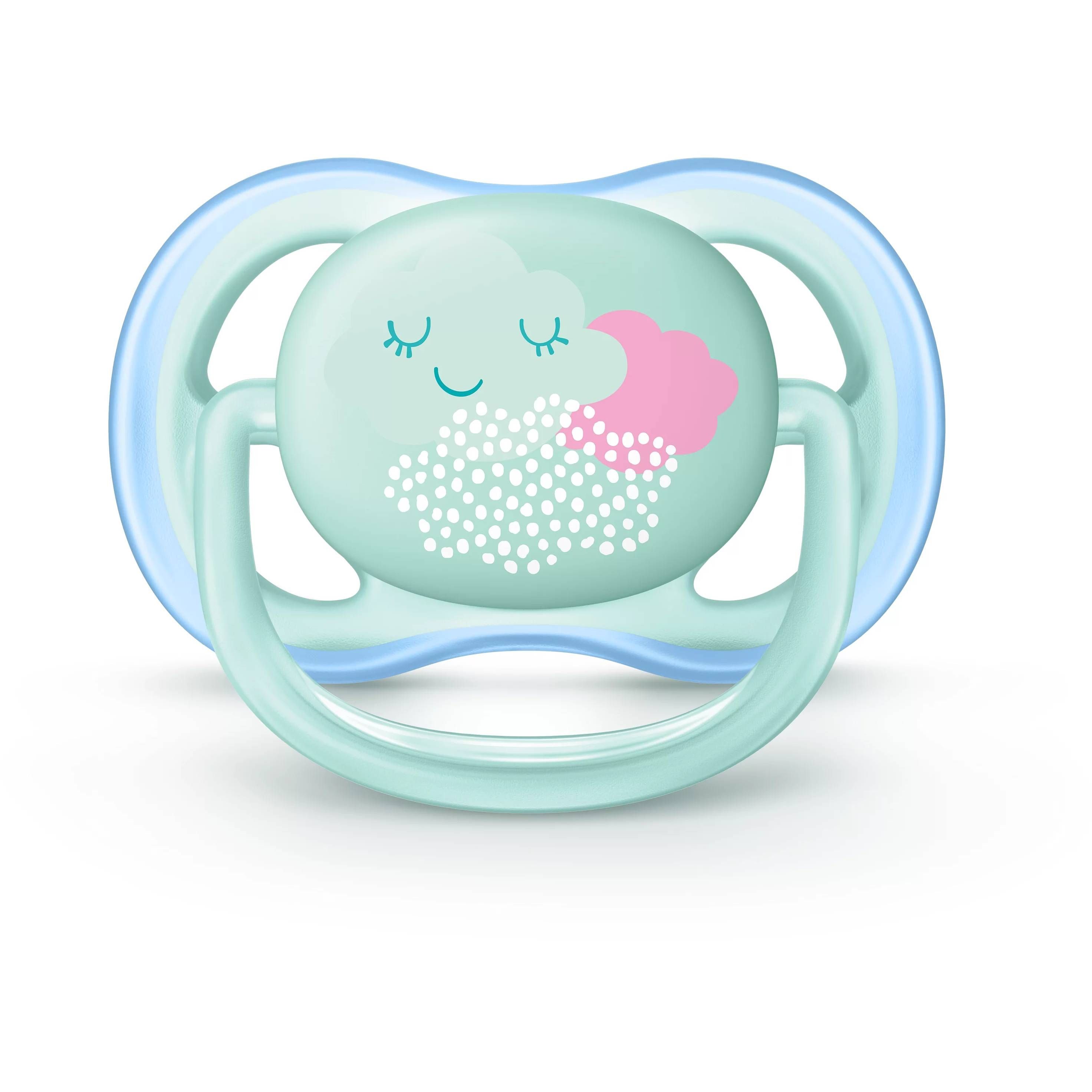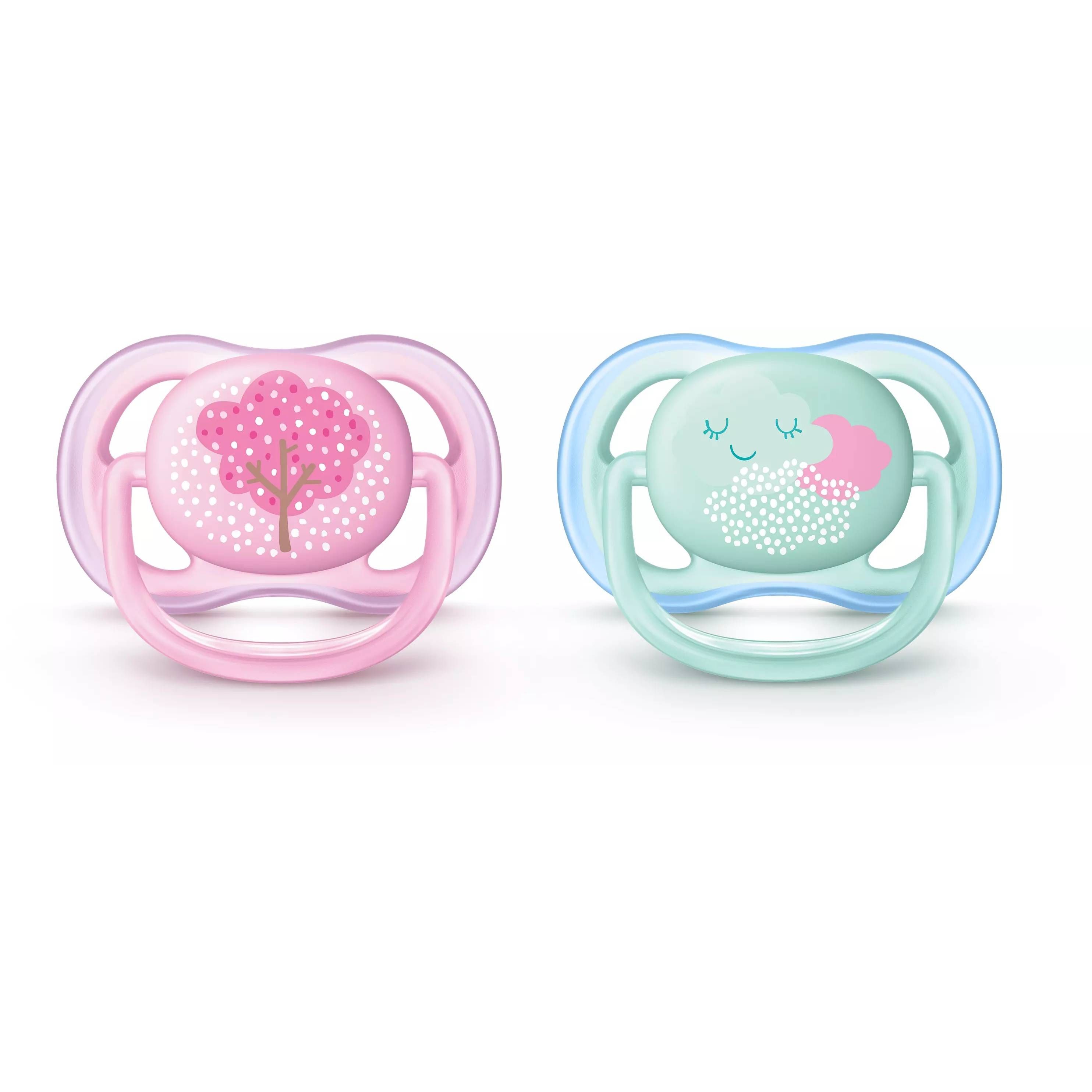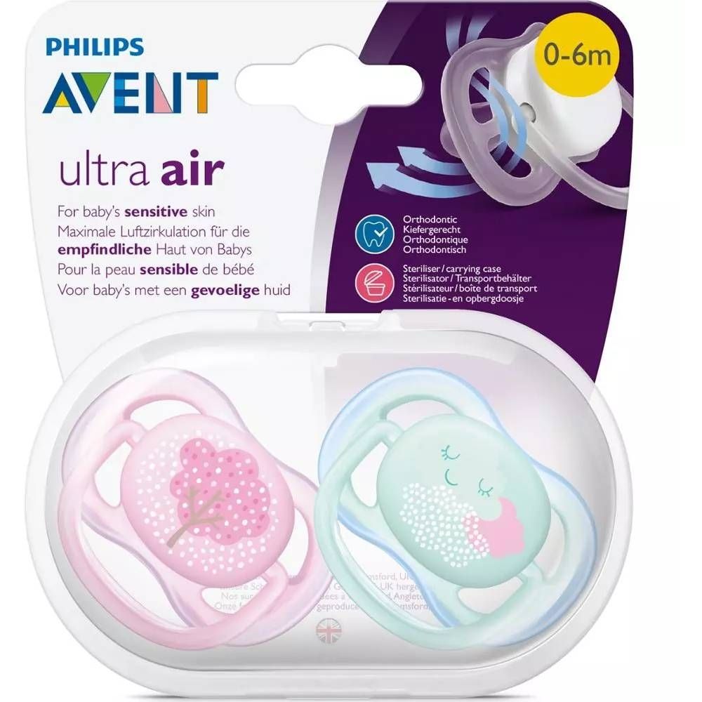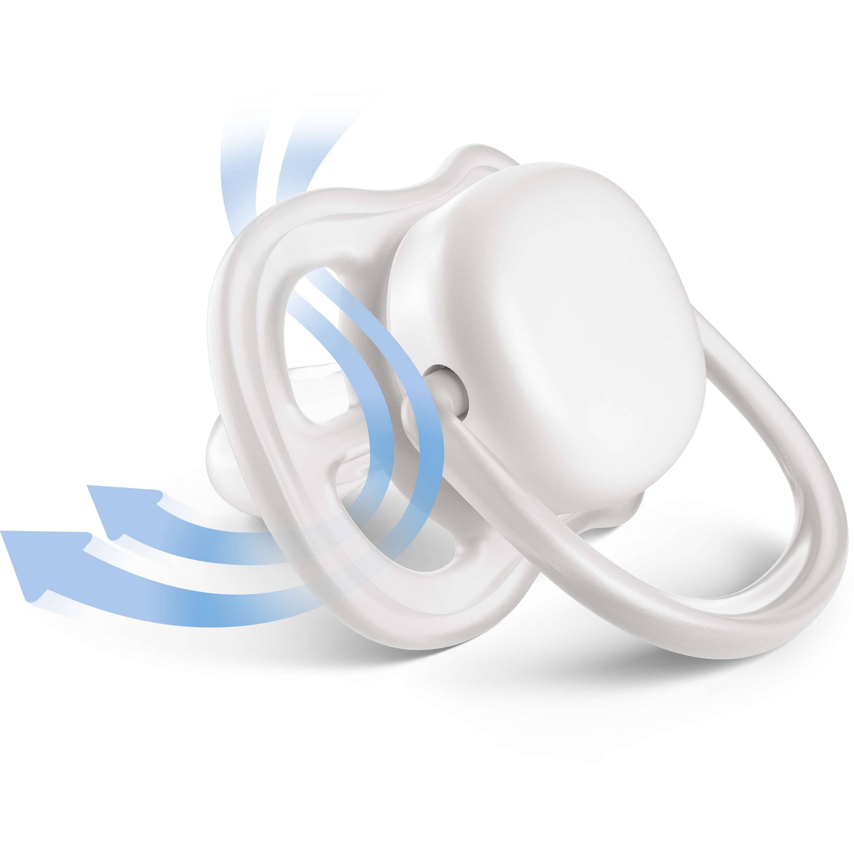 Set de 2 suzete Philips AVENT ultra air SCF343/20, 0-6 luni, Ortodontice, Tetine catifelate extra ferme, Fără BPA, Menține pielea sensibilă fină și uscată, Mâner cu inel de siguranță, Cutie transport