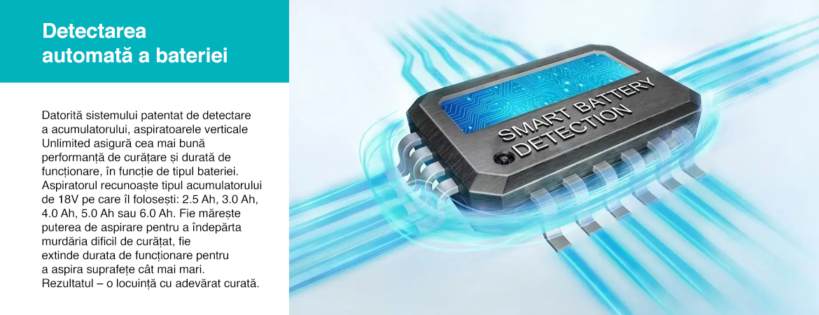 Datorită sistemului patentat de detectare a acumulatorului, aspiratoarele verticale Unlimited asigură cea mai bună performanță de curățare și durată de funcționare, în funcție de tipul bateriei. Aspiratorul recunoaște tipul acumulatorului de 18V pe care îl folosești: 2.5 Ah, 3.0 Ah, 4.0 Ah, 5.0 Ah sau 6.0 Ah. Fie mărește puterea de aspirare pentru a îndepărta murdăria dificil de curățat, fie extinde durata de funcționare pentru a aspira suprafețe cât mai mari. Rezultatul – o locuință cu adevărat curată.