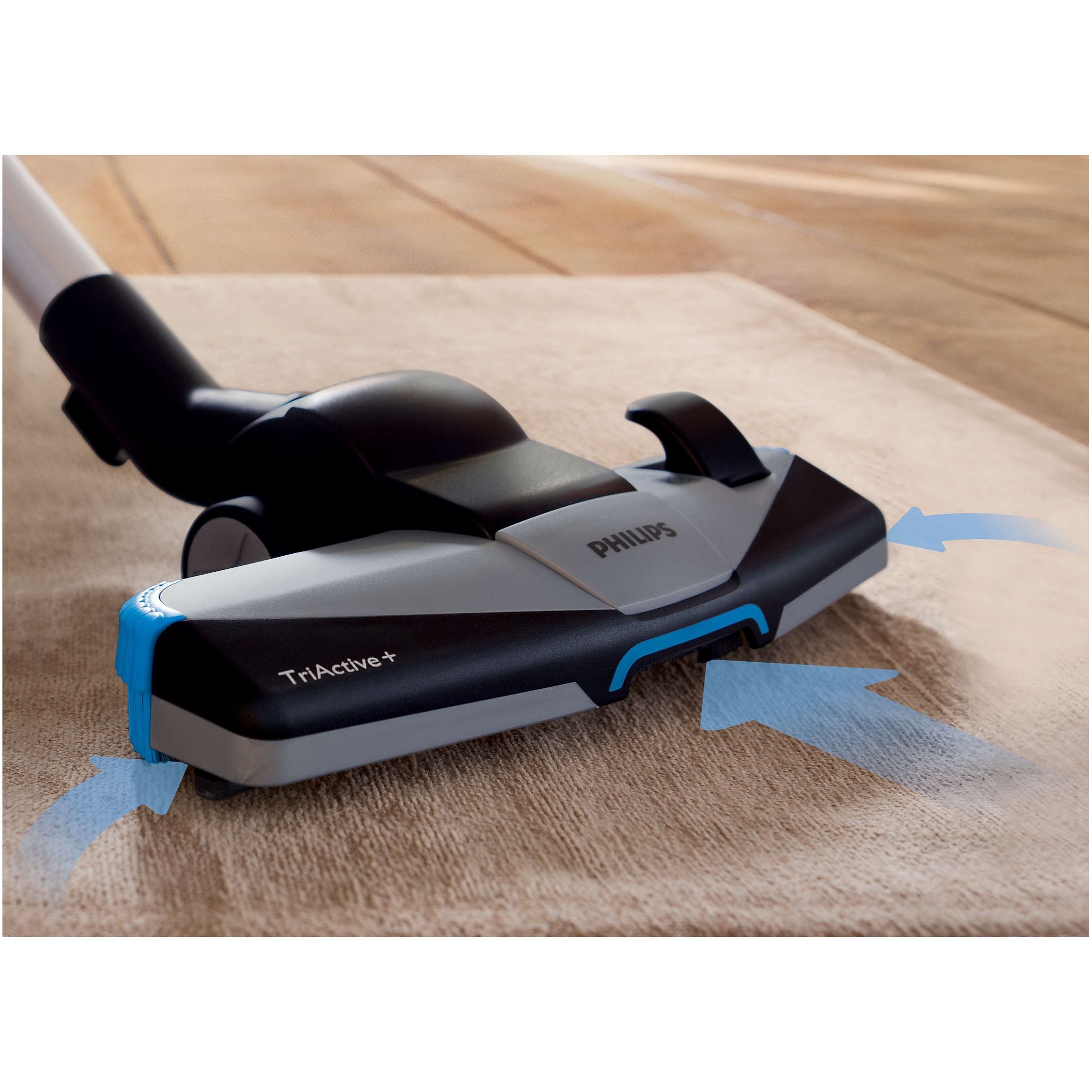 Putere de aspirare din 3 direcţii. Capul de aspirare TriActive+ are canale de aer care permit îndepărtarea prafului din partea din faţă a capului de aspirare, precum şi din lateral. Dintr-o singură mişcare, praful este îndepărtat din 3 direcţii.