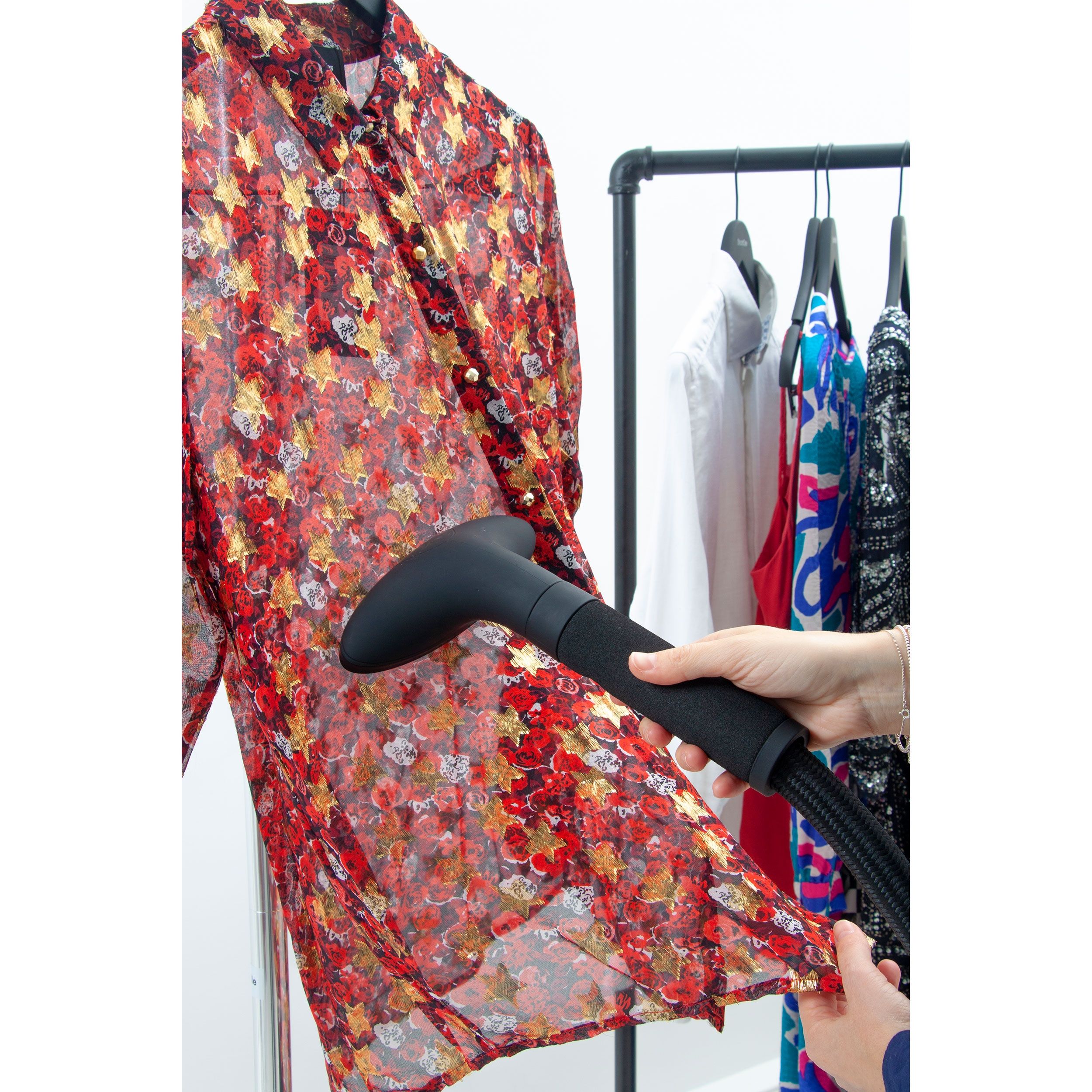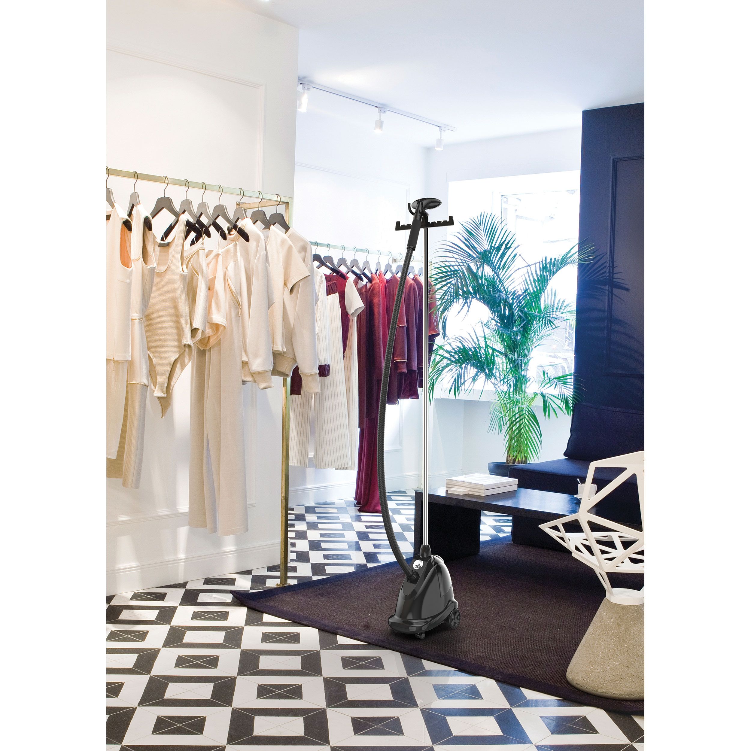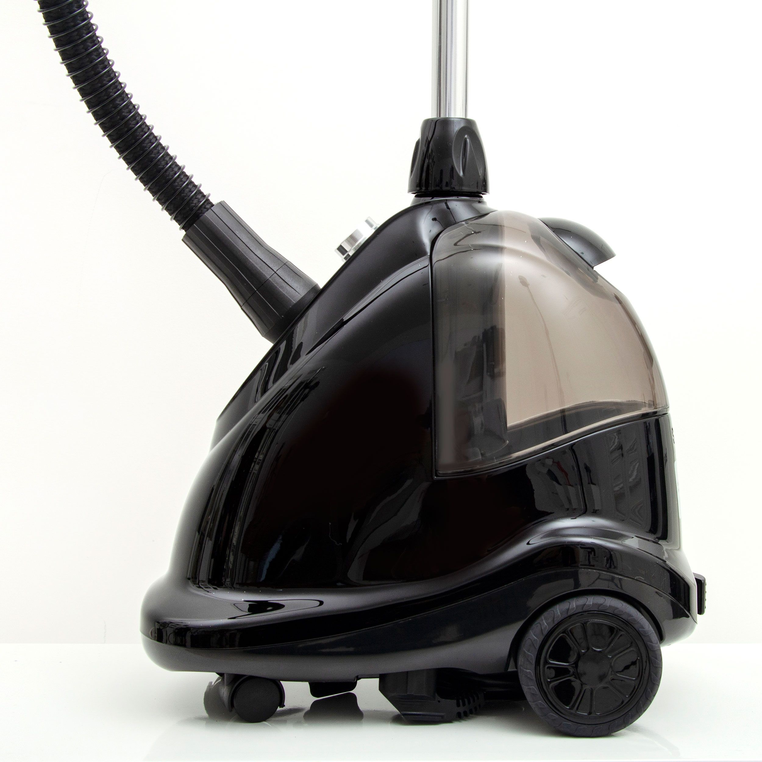 Recomandat pentru uz intens. Boiler din alamă (2000W). Gata de utilizare în 60 de secunde. Întrerupător de picior (comutare rapidă). Jet de abur continuu 42g/min. Talpă din oțel inoxidabil (ultra-rezistentă ce nu se zgârie). Moduri: mătase, lenjerie de in, bumbac, denim. Rezervor de apă (2.5 litri) - autonomie de până la 80 minute de călcare continuă. Se închide automat când rămâne fără apă. Baghetă ergonomică ultra ușoară (încastrată în spumă pentru mai mult confort). Furtun triplu-insulat. Tijă fixă din aluminiu. 4 accesorii - umeraș pro, mănușă / placă mini, perie pentru îndepărtarea scamelor). Finisaje cromate. Cablu de alimentare de 5 metri. Sistem de decalficiere integrat. 4 roți cauciucate integrate de 360° pentru mobilitate ridicată.
