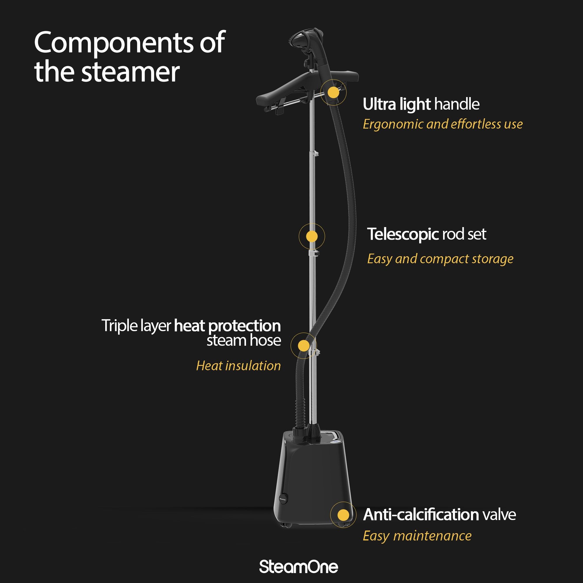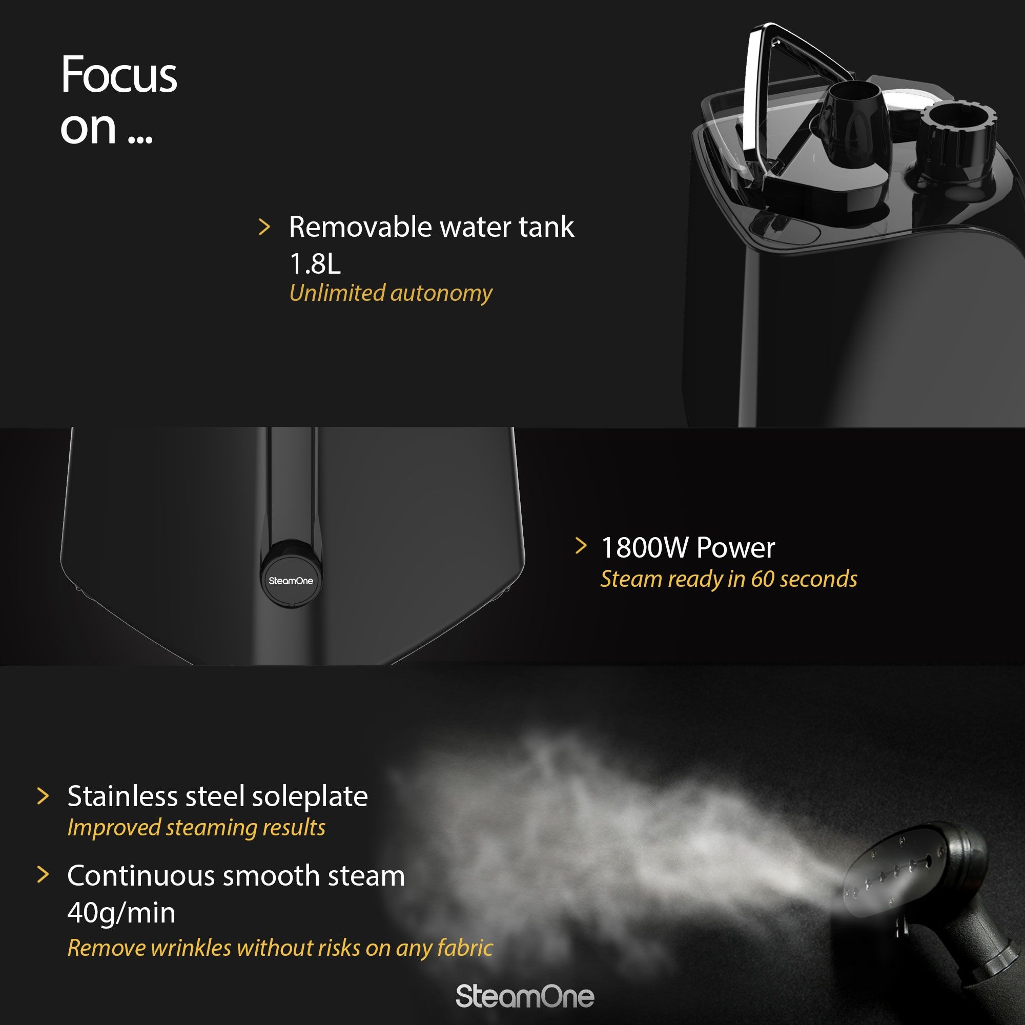 Boiler din aluminiu (1800W). Gata de utilizare în 60 de secunde. Jet de abur continuu 40g/min. Talpă din oțel inoxidabil (ultra-rezistentă ce nu se zgârie). Rezervor de apă (1.8 litri) - autonomie de până la 45 minute de călcare continuă. Se închide automat când rămâne fără apă. Baghetă ergonomică ultra ușoară (încastrată în spumă pentru mai mult confort). Furtun triplu-insulat. Tijă telescopică din aluminiu. 4 accesorii - umeraș, cârlig, mănușă, placă mini). Finisaje cromate. Cablu de alimentare de 2 metri. Sistem de decalficiere integrat. 4 roți pentru mobilitate ridicată.