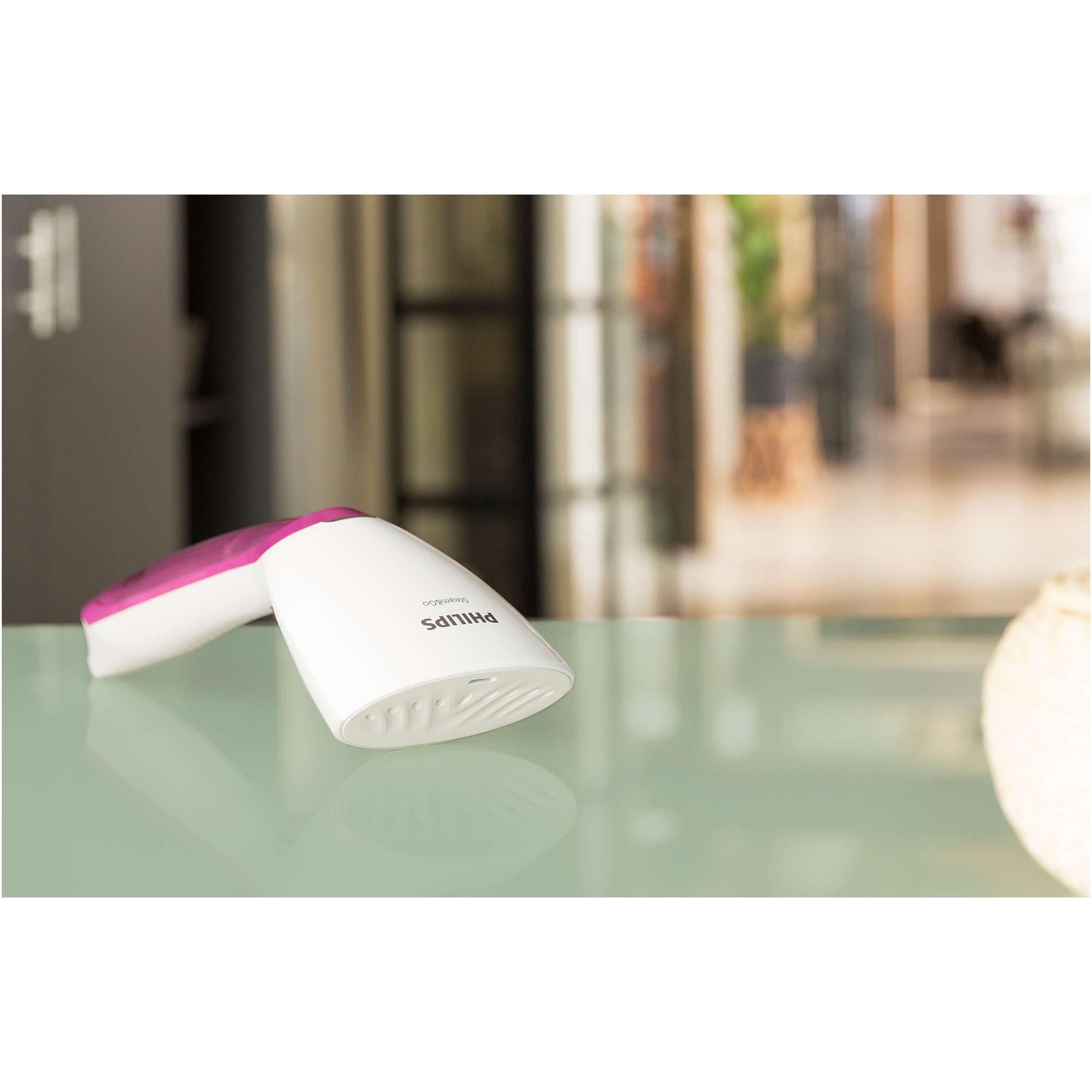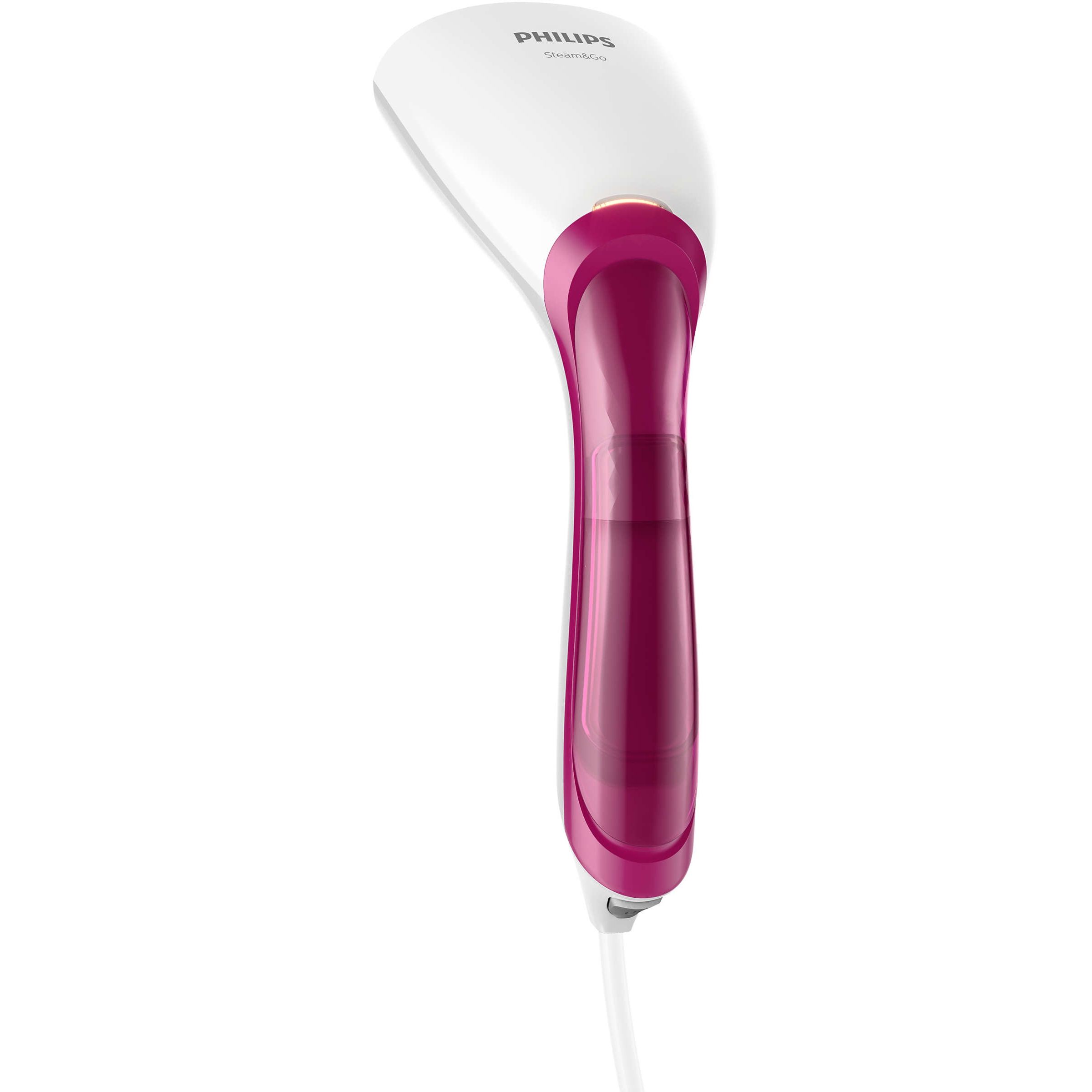 Aparat de călcat vertical portabil pentru haine Philips GC350/40, Gama Steam&Go, Putere 1000W, Gata < 1min, Abur continuu 20g/min, Rezervor Det 70ml, Cablu alimentare 2.5m, Mănuşă, Perie