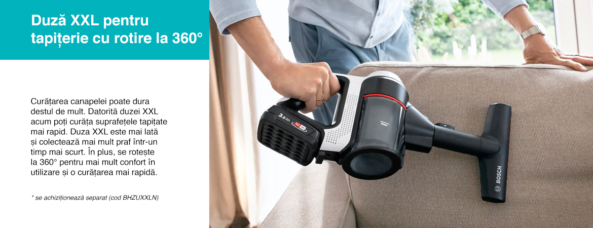 ¹Performanță: În mod Turbo produsul atinge aceeași putere de aspirare precum cea obținută de un aspirator cu cablu conform (EU) No 666/2013 ( EN 60312:2017). Energie: Acumulatorul are mai multă energie comparativ cu un acumulator de 18V Bosch Power For All de 3Ah.