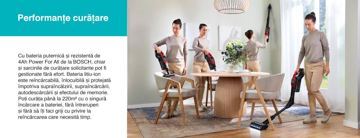 Cu bateria puternică și rezistentă de 4Ah Power For All de la BOSCH, chiar și sarcinile de curățare solicitante pot fi gestionate fără efort. Bateria litiu-ion este reîncărcabilă, înlocuibilă și protejată împotriva supraîncălzirii, supraîncărcării, autodescărcării și efectului de memorie. Poți curăța până la 220m² cu o singură încărcare a bateriei - fără întreruperi și fără să îți faci griji cu privire la reîncărcarea care necesită timp.