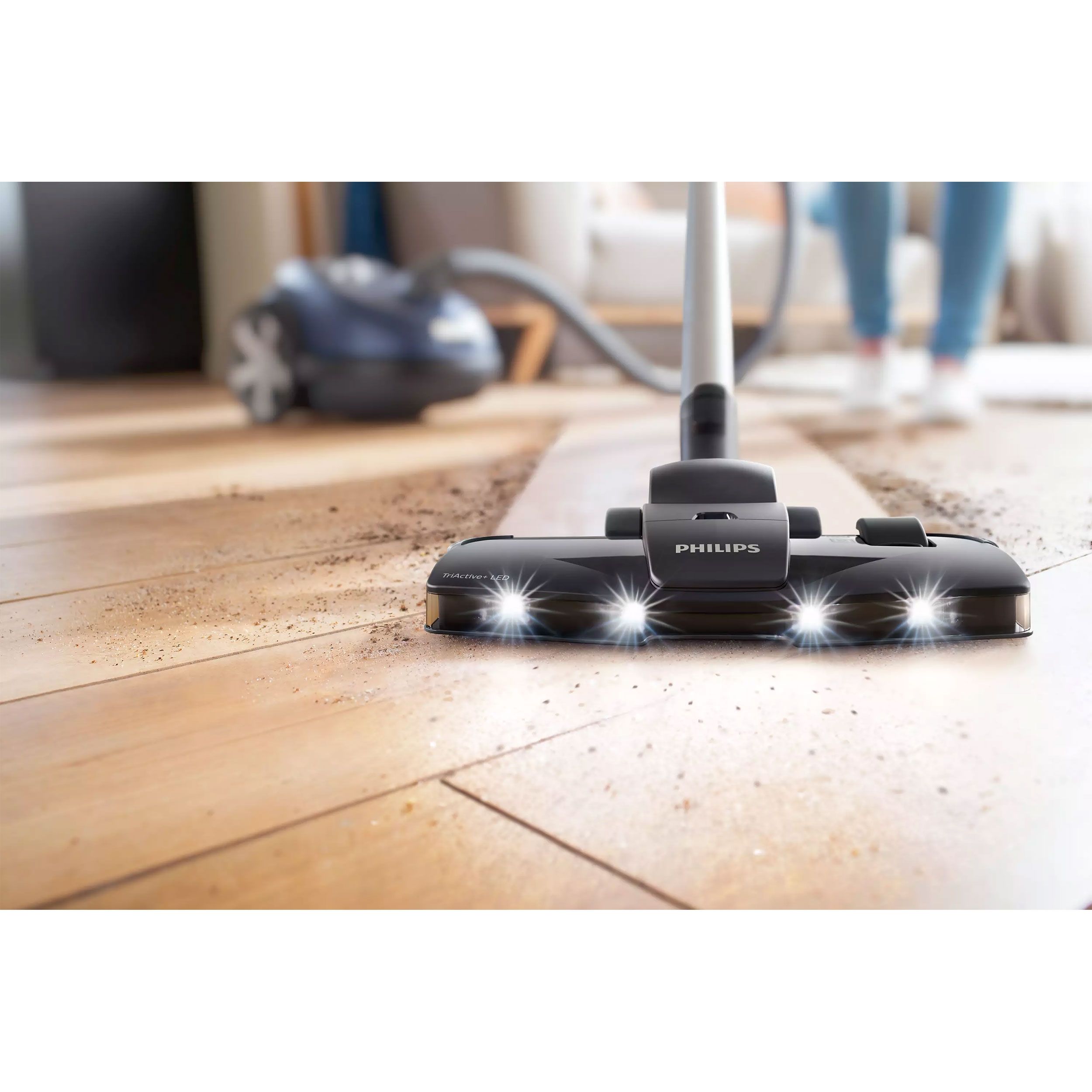 O podea curată înseamnă o locuinţă mai sănătoasă. Aspiratorul cu sac Philips Performer Silent dispune de tehnologie avansată de iluminare a podelei, cu cap de aspirare TriActive+ LED ce scoate la iveală praful ascuns.