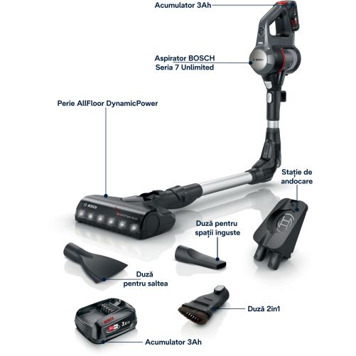 Acum este posibil: aspiratorul vertical Unlimited 7 oferă aceeași performanță de aspirare precum cea obținută de un aspirator cu cablu. Datorită acumulatorului puternic Bosch, a motorului ce funcționează cu până la 66,000 rpm și a periei motorizate cu LED-uri, acest aspirator multifuncțional este la fel de puternic precum cel cu cablu² și asigură rezultate excelente de îndepărtare a murdăriei și o curățare versatilă.