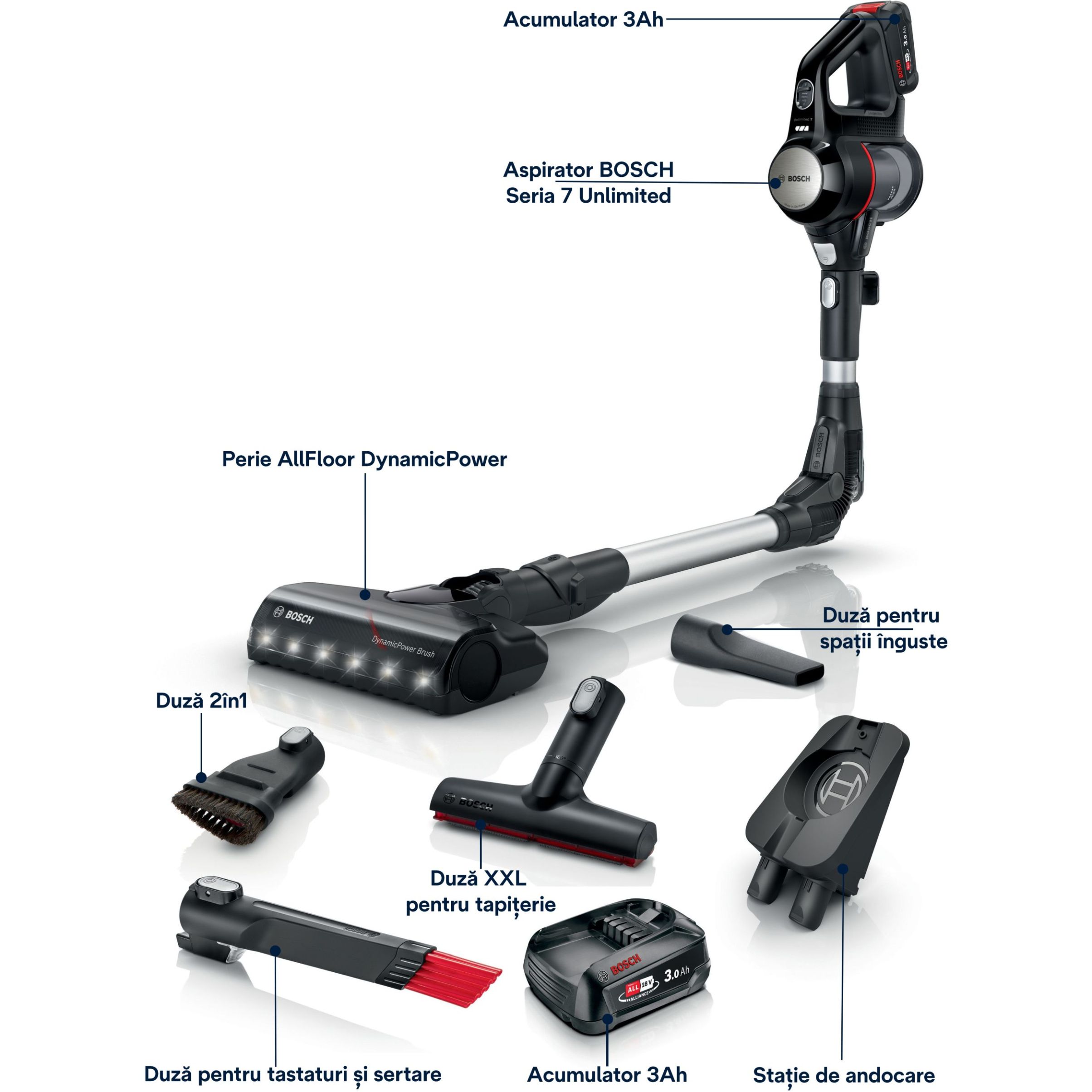 Acum este posibil: aspiratorul vertical Unlimited 7 oferă aceeași performanță de aspirare precum cea obținută de un aspirator cu cablu. Datorită acumulatorului puternic Bosch, a motorului ce funcționează cu până la 66,000 rpm și a periei motorizate cu LED-uri, acest aspirator multifuncțional este la fel de puternic precum cel cu cablu² și asigură rezultate excelente de îndepărtare a murdăriei și o curățare versatilă.