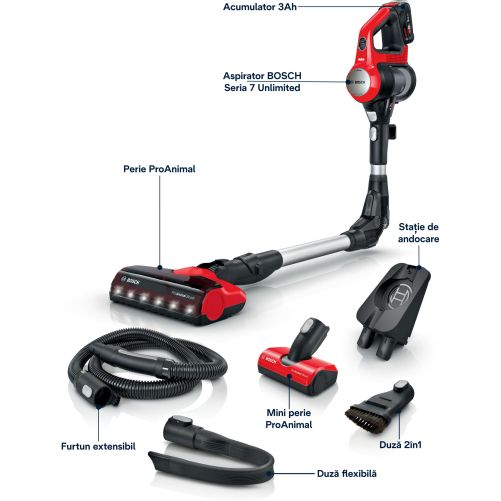 Acum este posibil: aspiratorul vertical Unlimited 7 oferă aceeași performanță de aspirare precum cea obținută de un aspirator cu cablu. Datorită acumulatorului puternic Bosch, a motorului ce funcționează cu până la 66,000 rpm și a periei motorizate cu LED-uri, acest aspirator multifuncțional este la fel de puternic precum cel cu cablu² și asigură rezultate excelente de îndepărtare a murdăriei și o curățare versatilă.