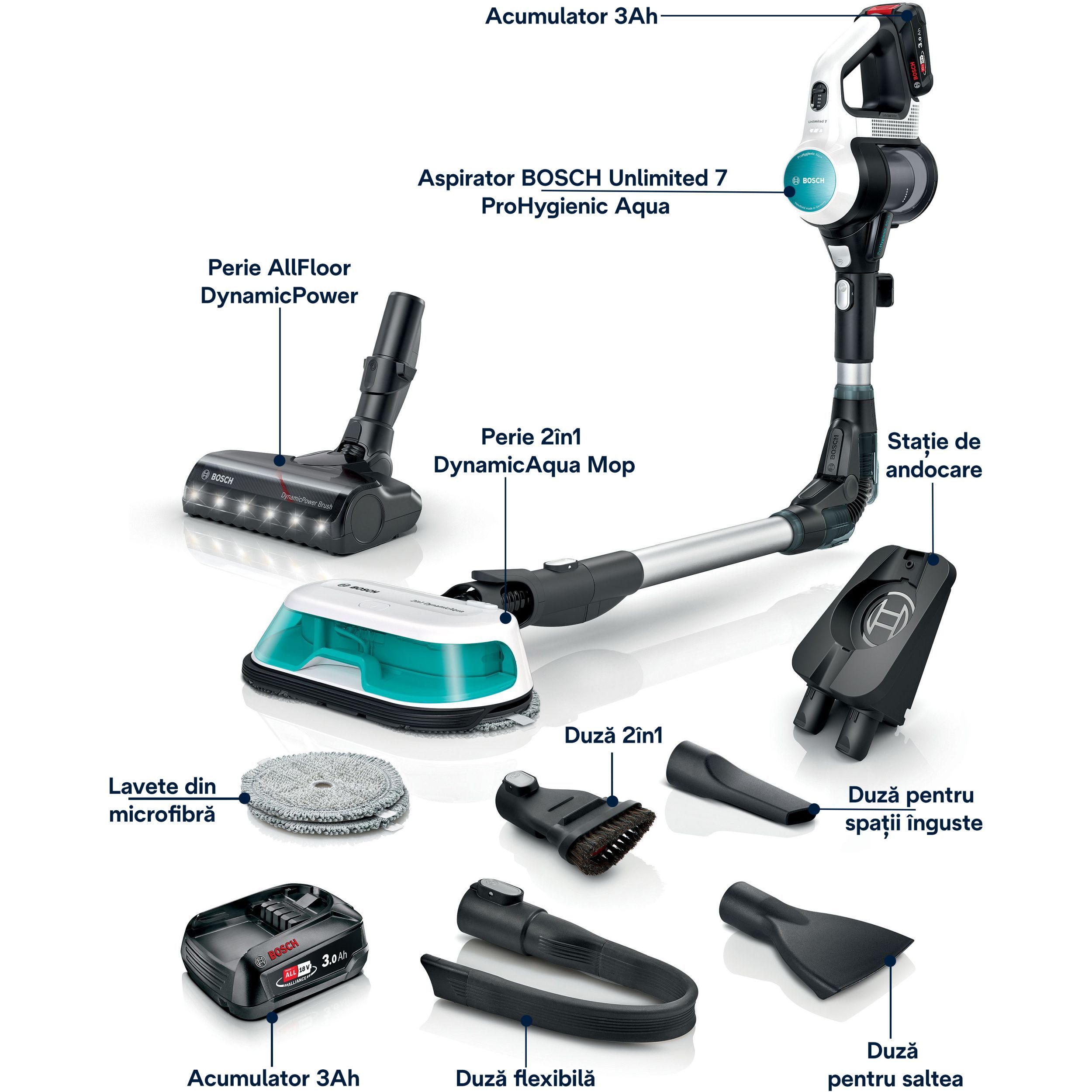 Unlimited 7 ProHygienic Aqua vine cu două perii principale care combină flexibilitatea cu ușurința în utilizare: 2in1 DynamicAqua Mop cu care aspiri și ștergi în același timp și peria AllFloor DynamicPower pentru curățarea convențională a covoarelor și a pardoselilor. Periile sunt ușor de manevrat, iar datorită tijei flexibile cureți cu ușurință sub mobila joasă fără să fie nevoie să te apleci.