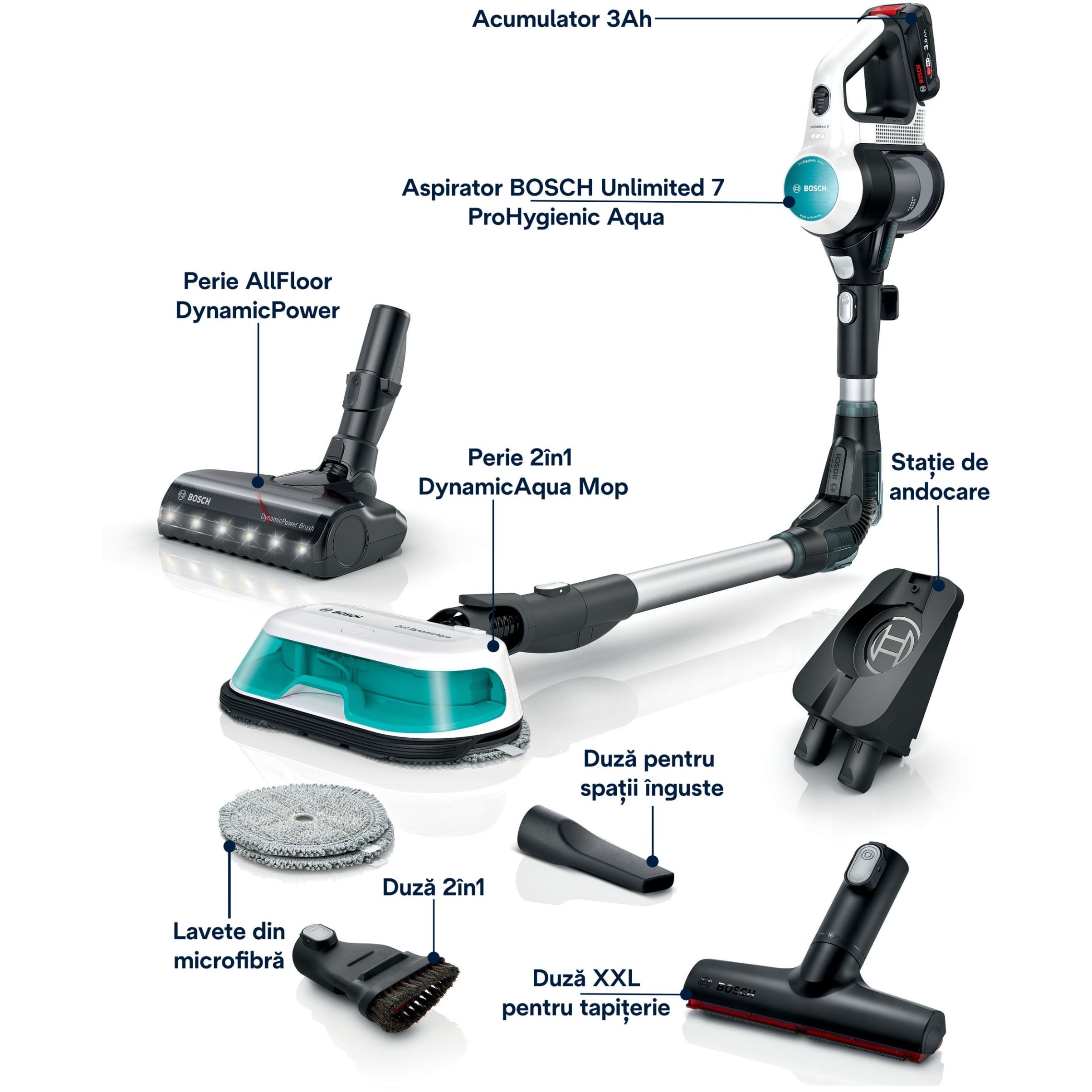 Unlimited 7 ProHygienic Aqua vine cu două perii principale care combină flexibilitatea cu ușurința în utilizare: 2in1 DynamicAqua Mop cu care aspiri și ștergi în același timp și peria AllFloor DynamicPower pentru curățarea convențională a covoarelor și a pardoselilor. Periile sunt ușor de manevrat, iar datorită tijei flexibile cureți cu ușurință sub mobila joasă fără să fie nevoie să te apleci.