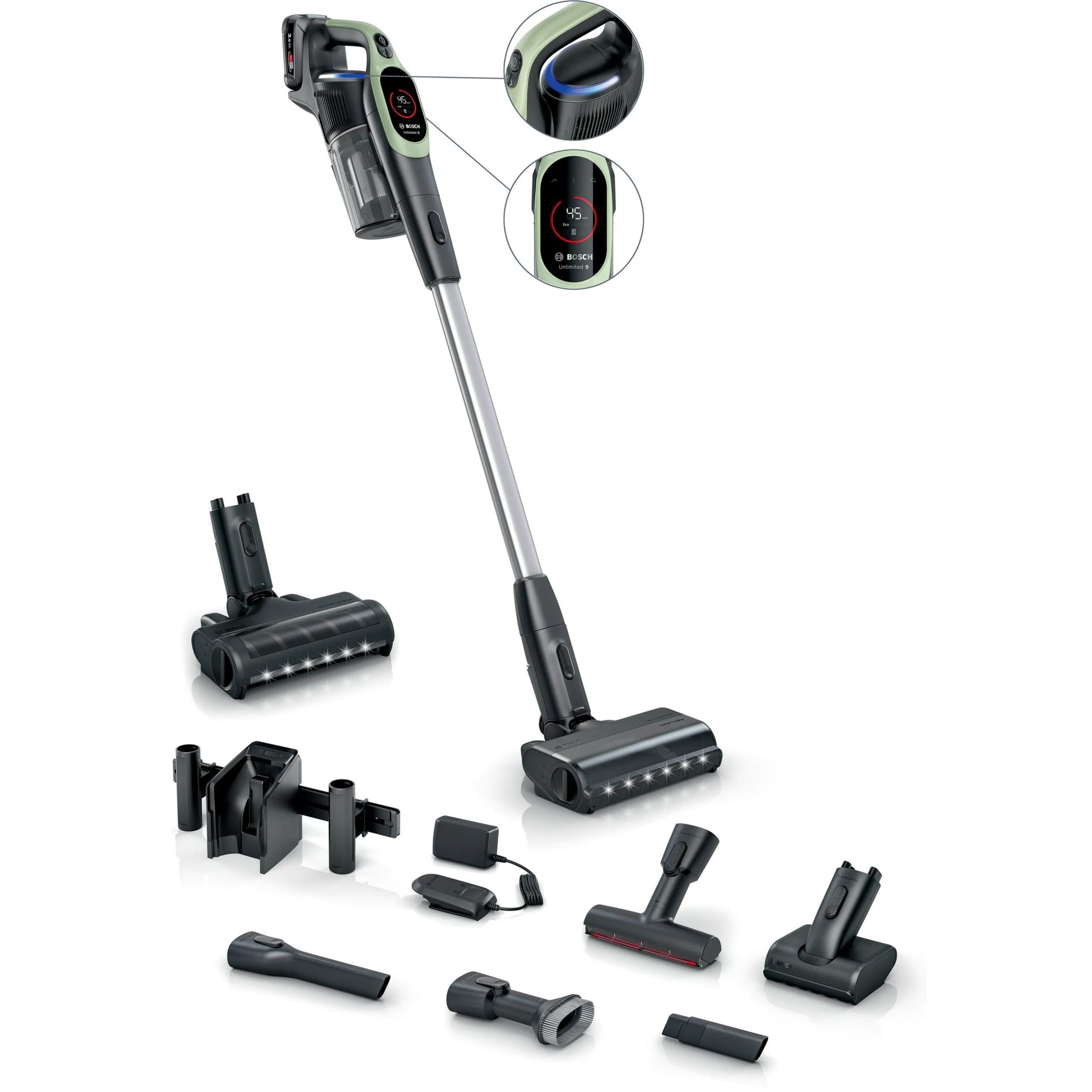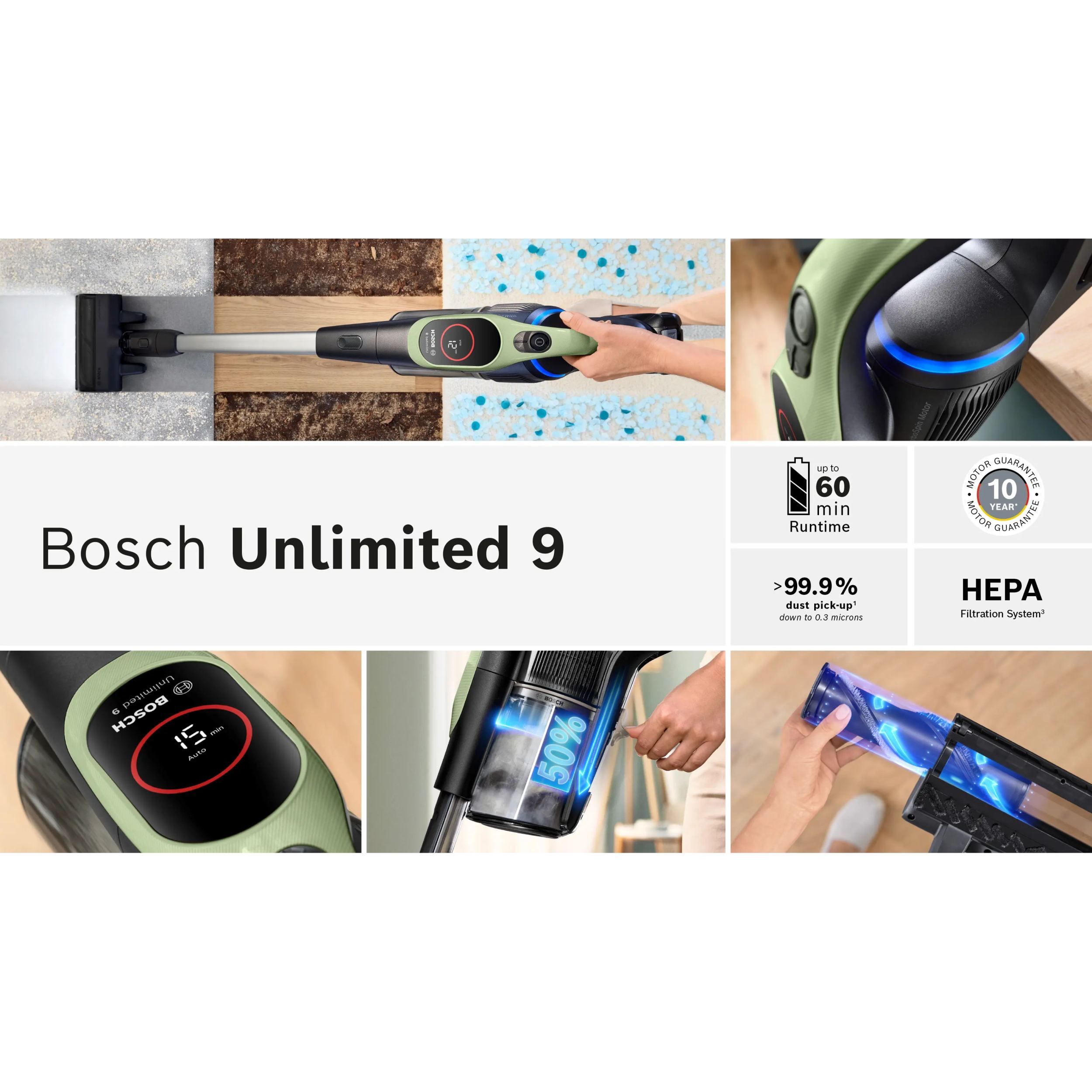 Unlimited 9 este echipat cu un display practic cu LED care afișează timpul de funcționare rămas și 3 moduri de putere pentru fiecare provocare. "Turbo" mărește performanța pentru sarcini dificile. Modul inteligent "Auto" ajustează performanța și durata de funcționare în funcție de podea și suprafață - indiferent dacă este covor sau podea tare și „Eco” oferă o durată de funcționare optimă, de lungă durată, pentru sarcinile de curățare de zi cu zi.