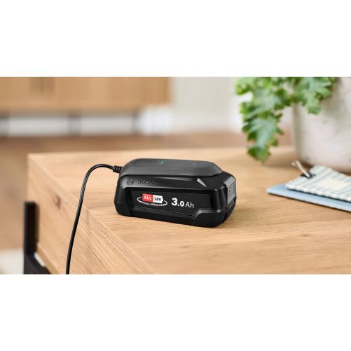 Cu bateria puternică de 3,0 Ah Power For All de la Bosch, chiar și sarcinile de curățare solicitante pot fi stăpânite fără efort. Bateria litiu-ion este reîncărcabilă, înlocuibilă și protejată împotriva supraîncălzirii, supraîncărcării, autodescărcării și efectului de memorie. Poți curăța până la 160 m² cu o singură încărcare a bateriei - fără întreruperi și fără să îți faci griji cu privire la reîncărcarea care necesită timp. Bateria interschimbabilă Power For All este compatibilă cu peste 100 de produse diferite de 18 V și cu peste 10 mărci.