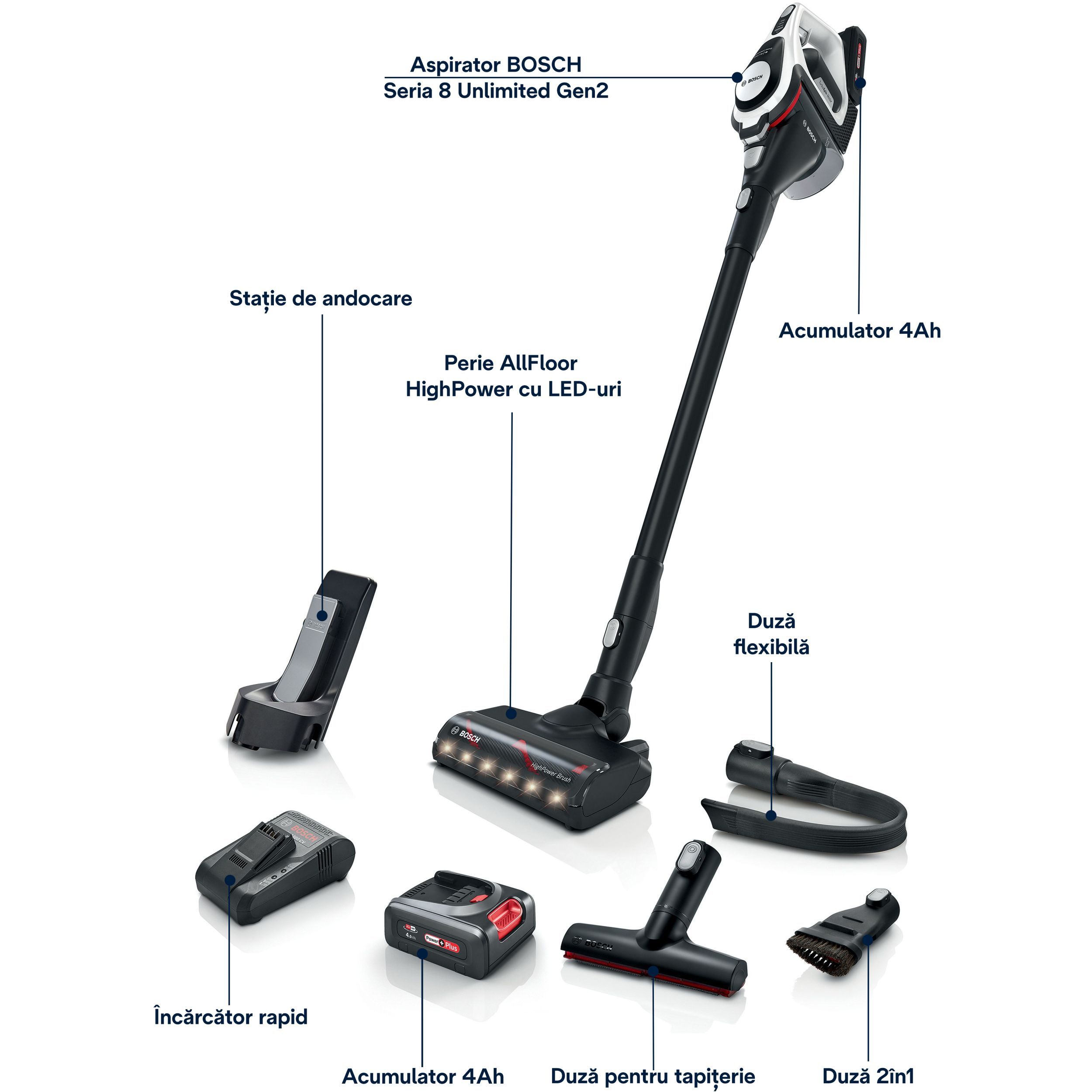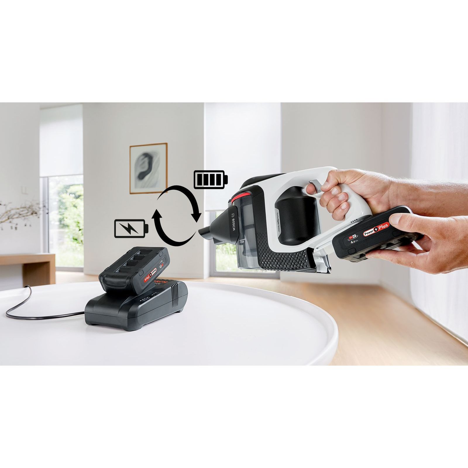 ¹Autonomie: O baterie este la încărcat în timp ce cealaltă este folosită in modul ECO. Performanță: în modul Turbo produsul atinge aceeași putere de aspirare precum un aspirator cu cablu conform (EU) No 666/2013 (. acc. to EN 60312:2017). Energie: Acumulatorul are mai multă energie comparativ cu un acumulator de 18V Bosch Power For All de 3Ah.