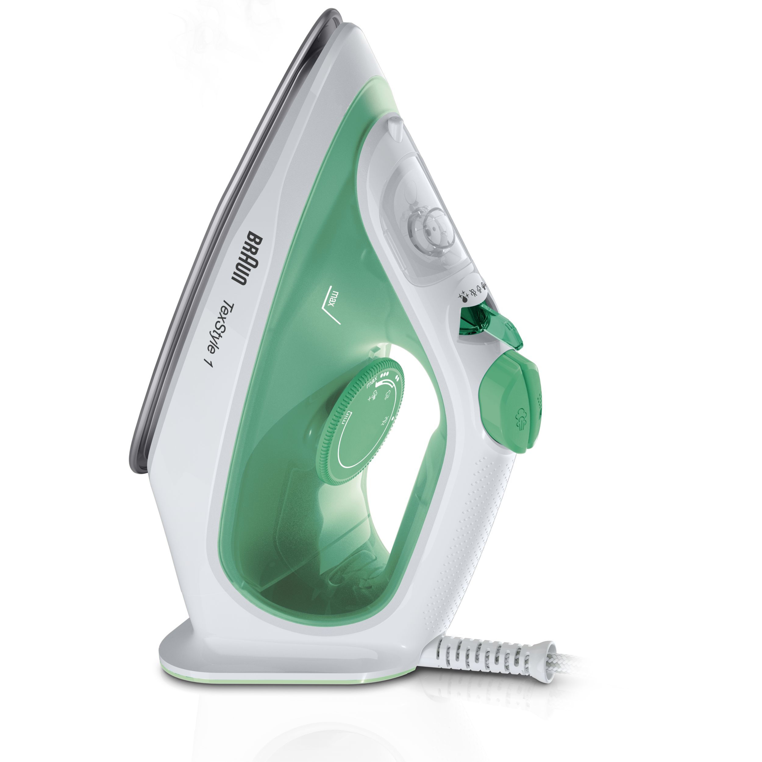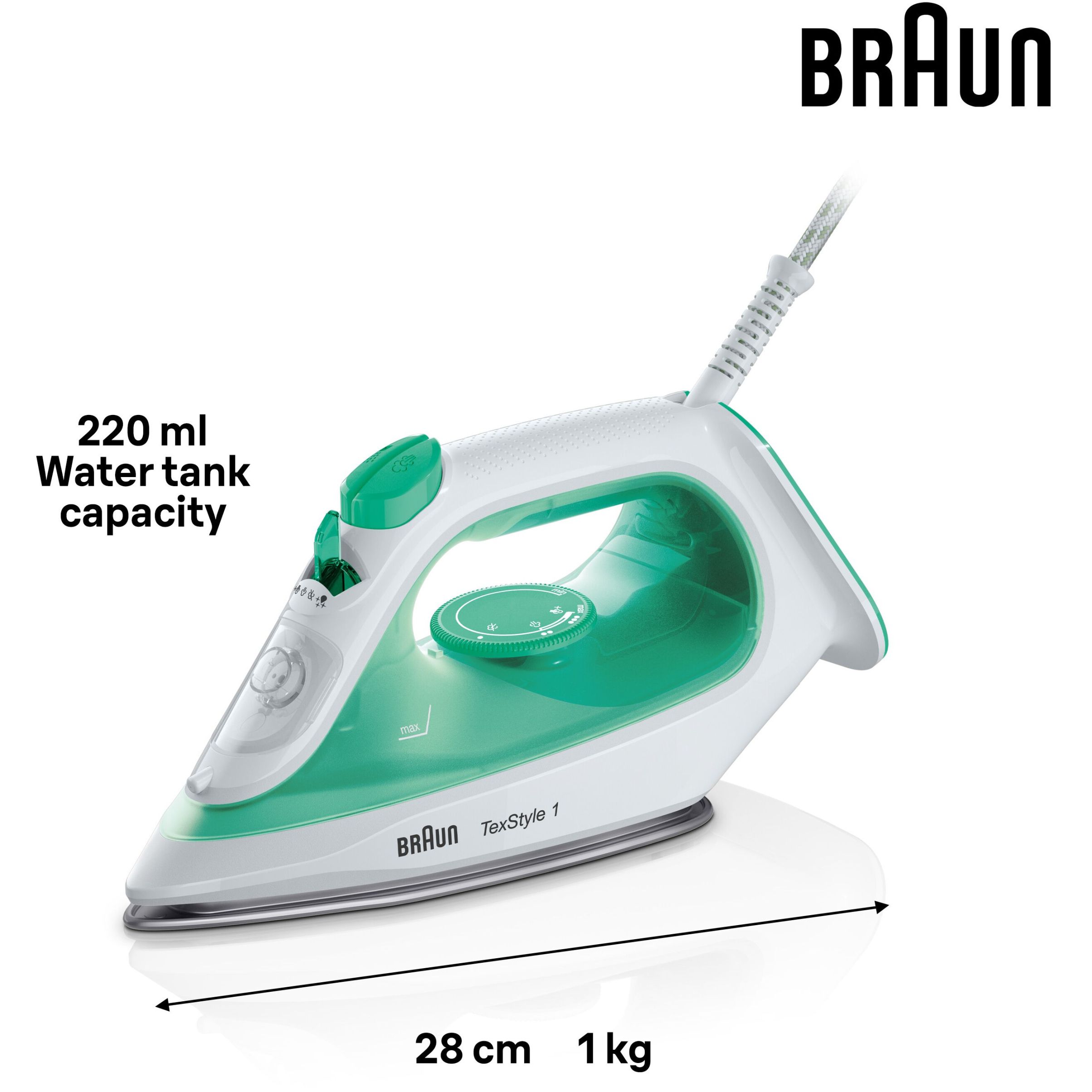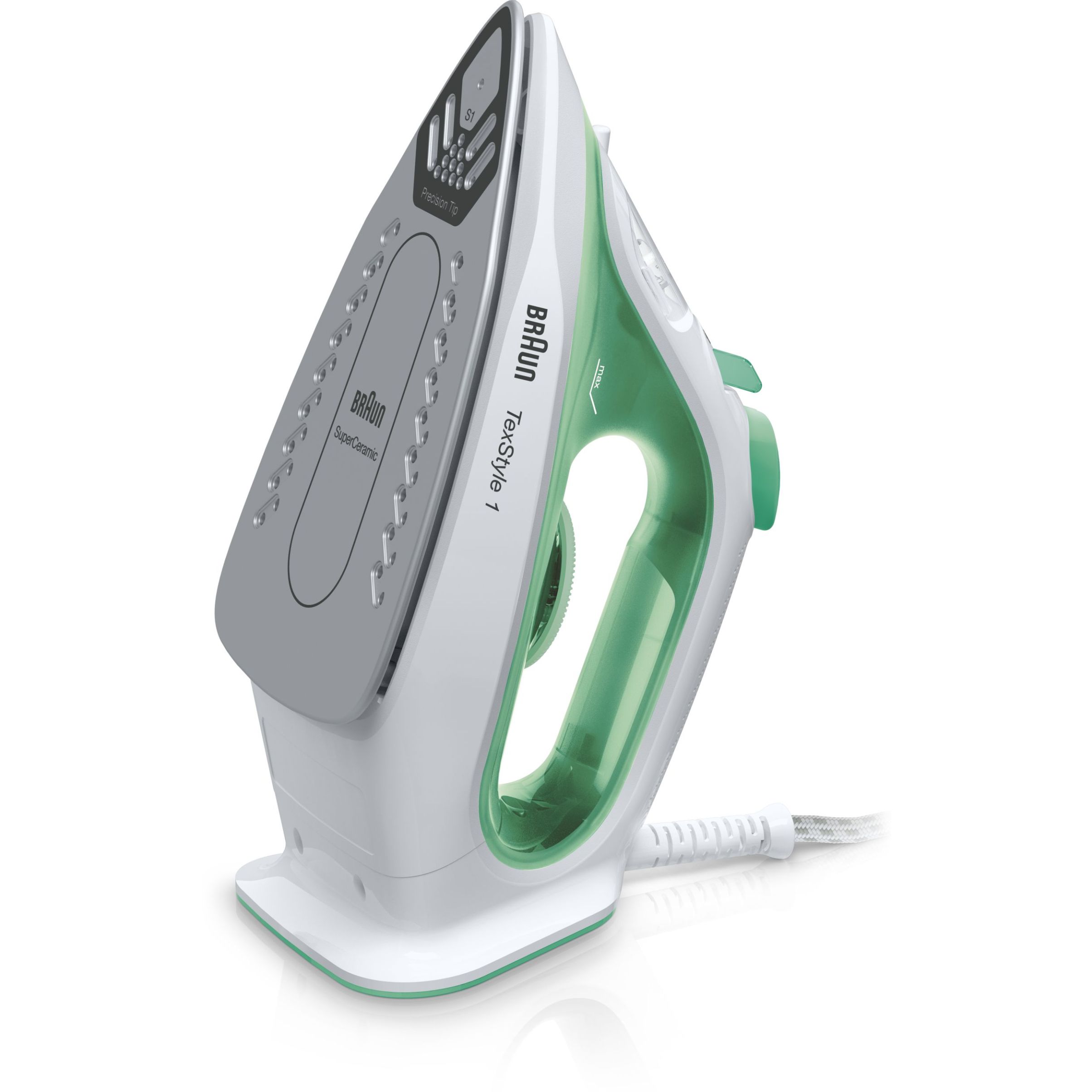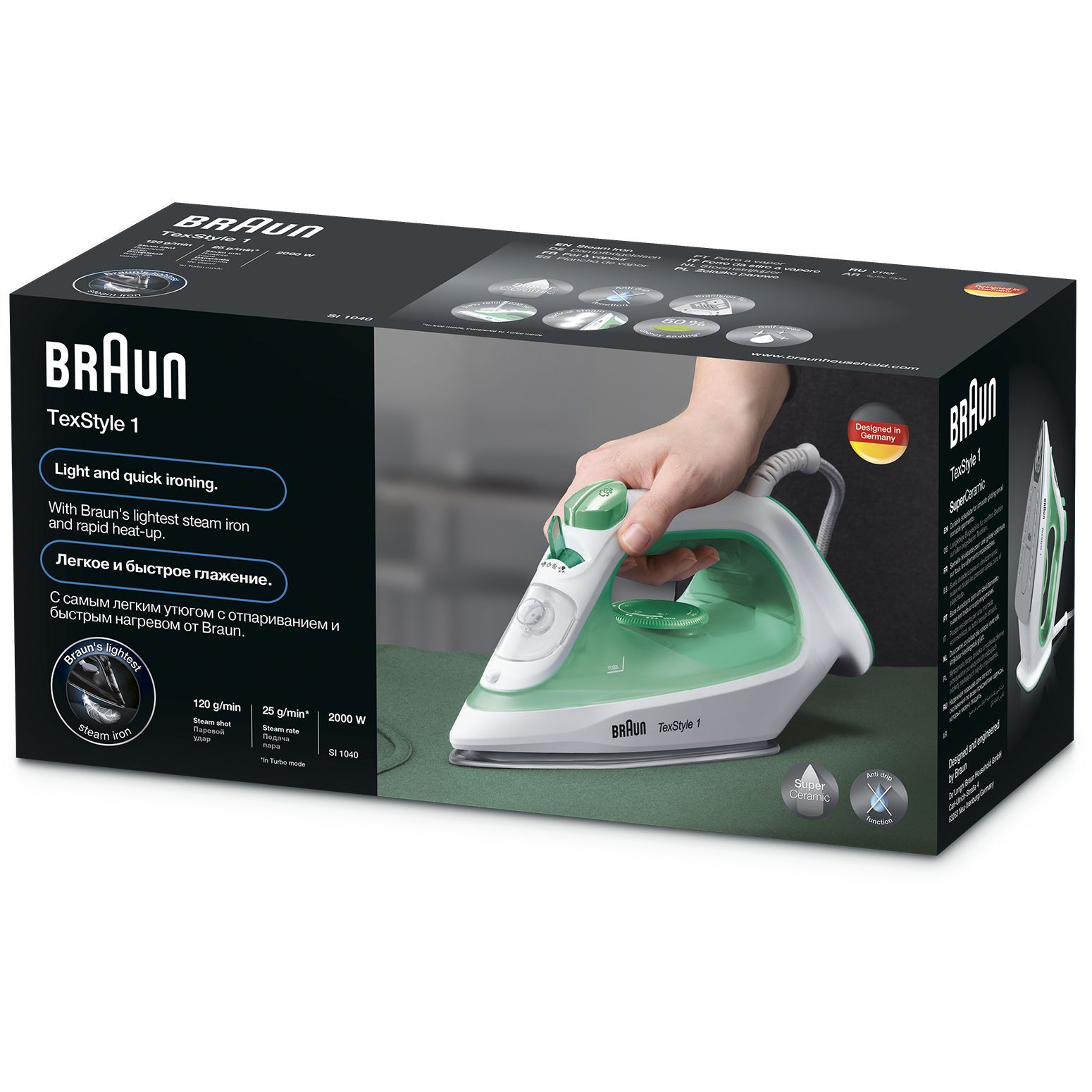 TexStyle 1 BRAUN este cel mai ușor fier de călcat cu abur, conceput pentru a călca rapid și ușor. Este prevăzut cu un strat SuperCeramic și antiadeziv în întreaga gamă, pentru un călcat delicat.