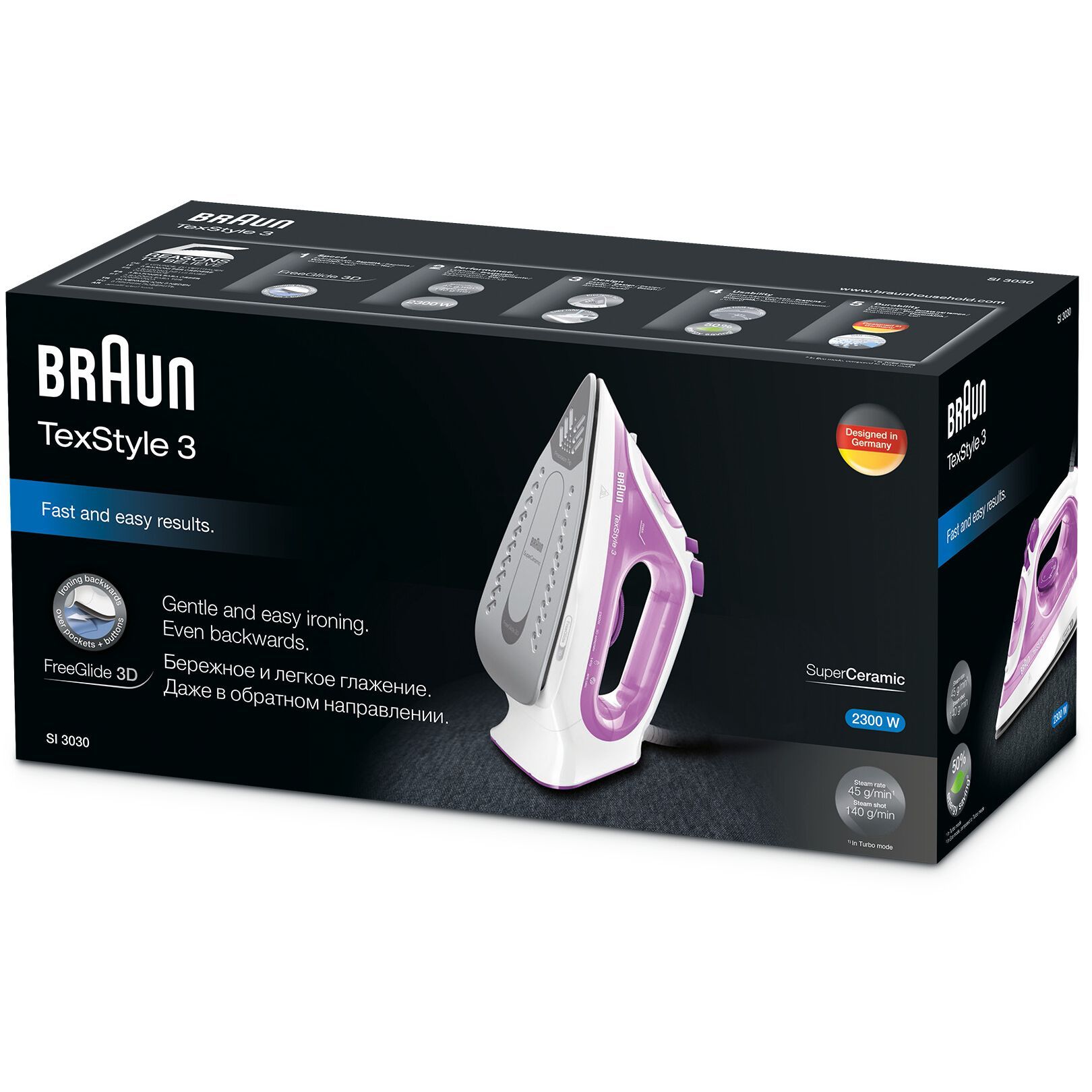Noul BRAUN TexStyle 3 a fost îmbunătățit cu un nou aspect, o putere mai mare și o performanță mai bună a aburului. Acum este dotat cu prima tehnologie FreeGlide 3D din lume, pentru o capacitate de alunecare de 360°.