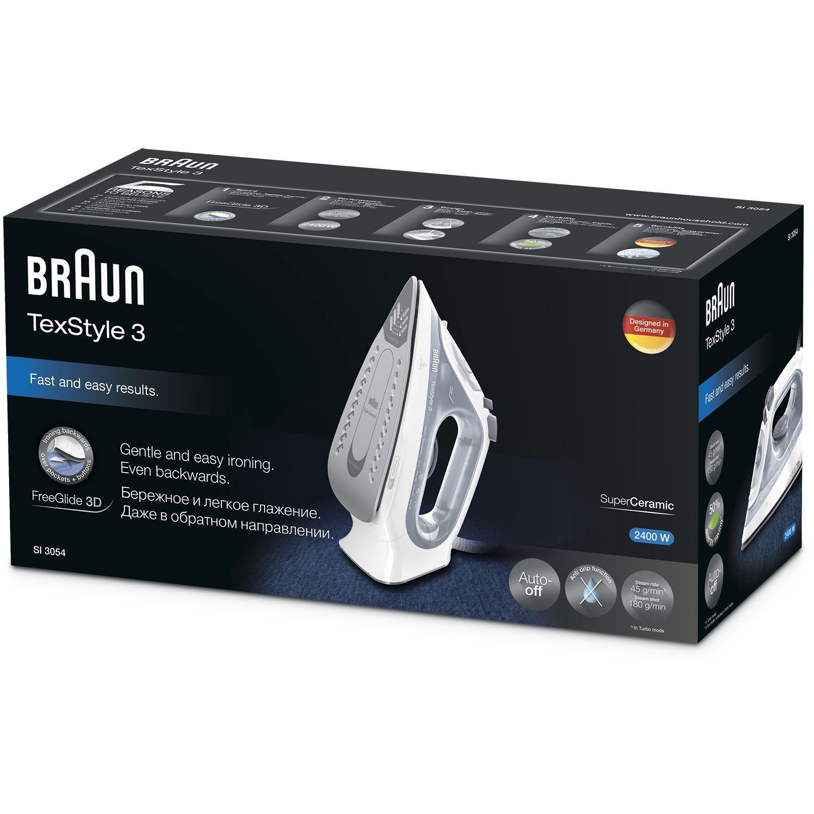 Fier de călcat BRAUN TexStyle 3 SI3054GY - 0127405004, 2350W, Continuu 45g/min, Jet 180g, Rezervor 270ml, Talpă SuperCeramic, FreeGlide 3D, Oprire automată, Cablu 2m, Grey