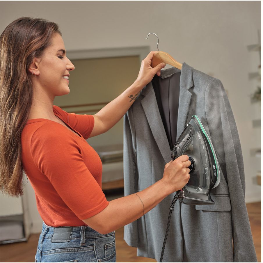 Călcare verticală cu abur - Retușuri rapide și ușoare, fără a fi necesară o masă de călcat. Jetul de abur vertical asigură împrospătarea rapidă a hainelor și perdelelor ușor cutate.
