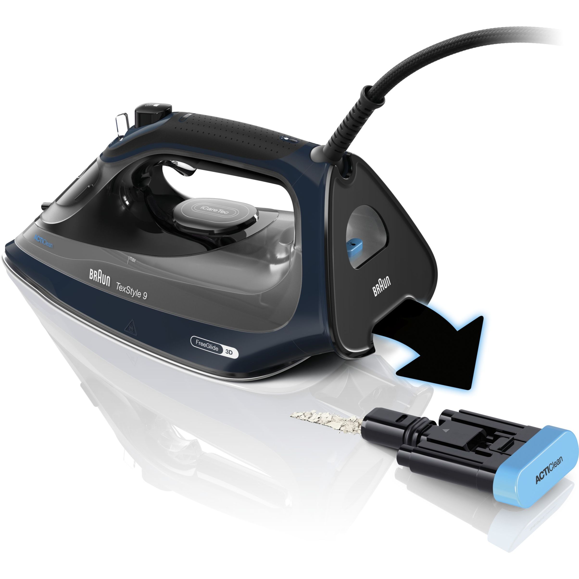TexStyle 9 este cel mai puternic fier de călcat cu aburi de la BRAUN, care are o putere de 3200W și este prevăzut cu prima tehnologie FreeGlide 3D din lume. În plus, este prevăzut cu noul sistem ActiCIean. Colectorul de calcar are un design unic ce face ca îndepărtarea depunerilor să fie mai puțin dificilă și cu 100% mai eficientă*, prelungind durata de viață a fierului de călcat cu aburi. TexStyle 9 prezintă, de asemenea, tehnologia iCare care protejează hainele utilizând o temperatură potrivită pentru fiecare tip de țesătură - oferind o protecție inteligentă materialelor textile.