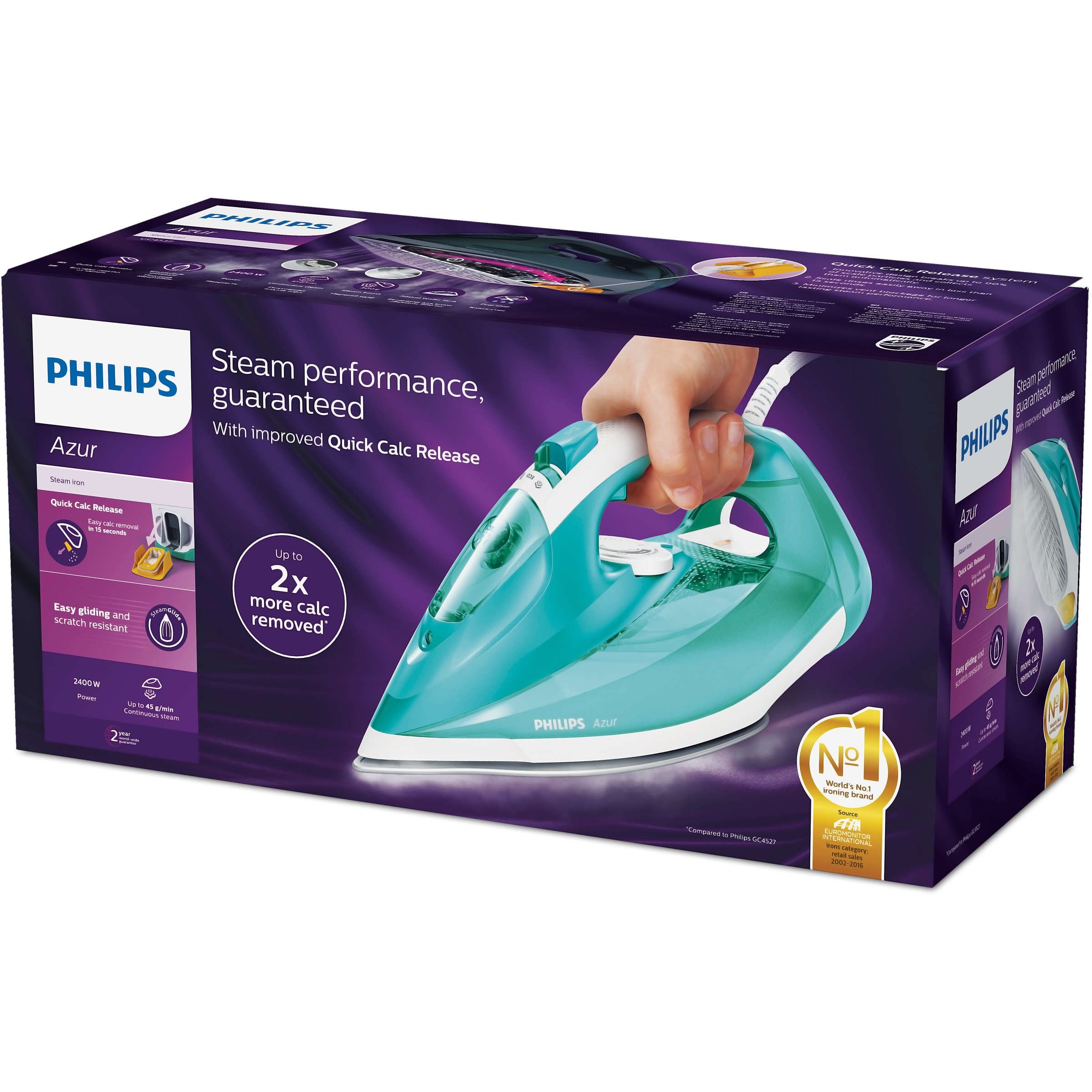 Sistem de decalcifiere rapidă pentru o curăţare uşoară a fierului tău de călcat. Decalcifiere rapidă pentru o curăţarea uşoară a fierului tău de călcat şi o performanţă de lungă durată a aburului.