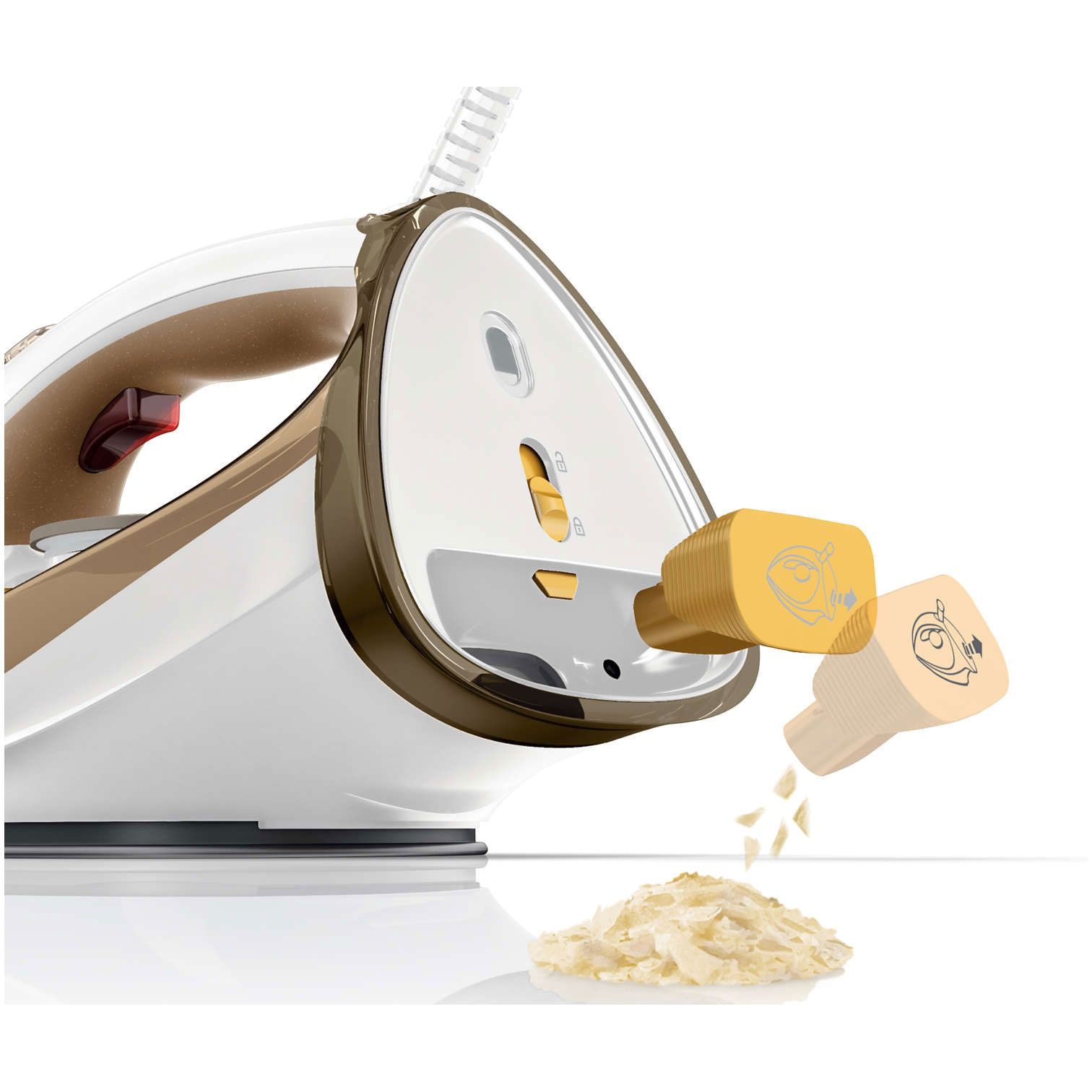 Recipientul pentru calcar încorporat colectează calcarul în timpul călcării. Recipientul pentru calcar conceput special şi încorporat colectează particulele de calcar în timpul călcării. Procesul de curăţare automată elimină calcarul din fierul de călcat, pentru a menţine performanţe consecvente de călcare, zi de zi.