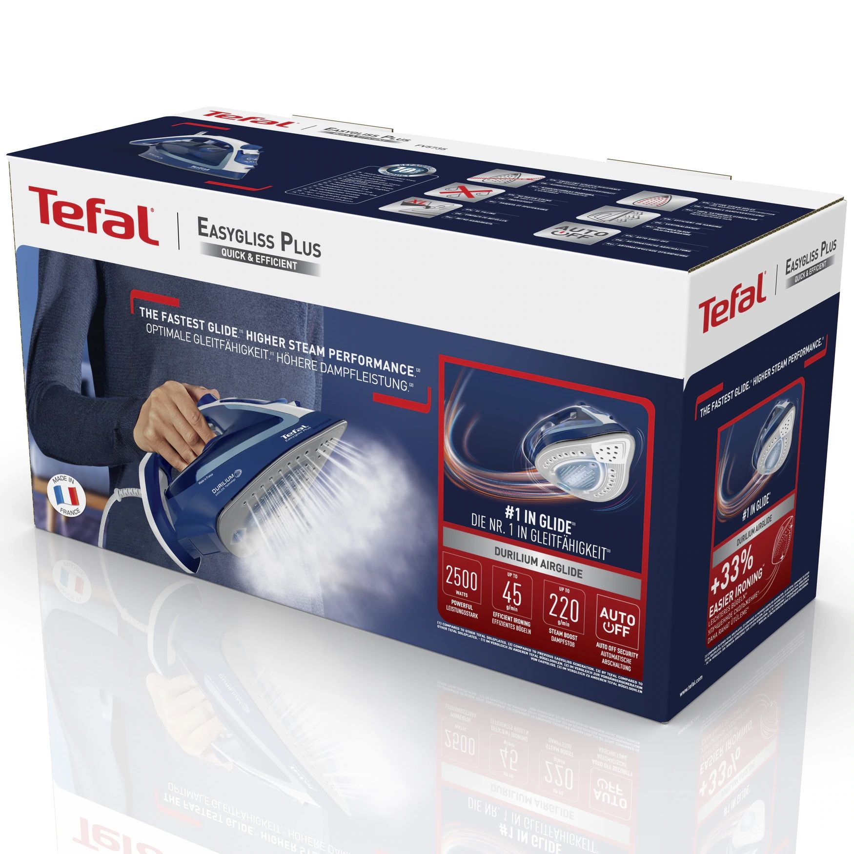 EasyGliss Plus este echipat cu talpa cu Tehnologia Durilium AirGlide, cea mai bună talpă Tefal la capitolul alunecare.